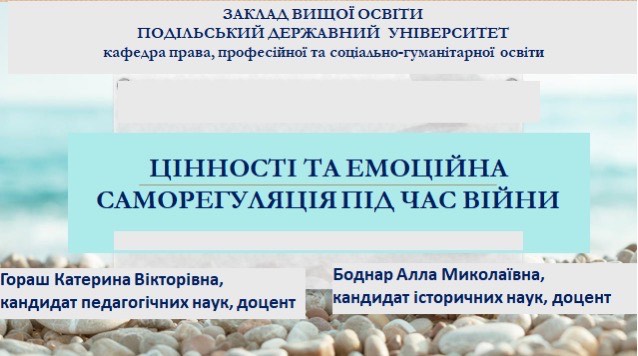01 травня 2025 року науково-педагогічними працівниками кафедри права, професійної та соціально-гуманітарної освіти Закладу вищої освіти «Подільський державний університет» – Аллою БОДНАР, завідувачкою кафедри, кандидаткою історичних наук, доценткою та Катериною ГОРАШ, кандидаткою педагогічних наук, доценткою було проведено психолого-педагогічний квест «ЦІННОСТІ ТА ЕМОЦІЙНА САМОРЕГУЛЯЦІЯ ПІД ЧАС ВІЙНИ» для здобувачів вищої освіти першого (бакалаврського) рівня за спеціальністю 201 «Агрономія».