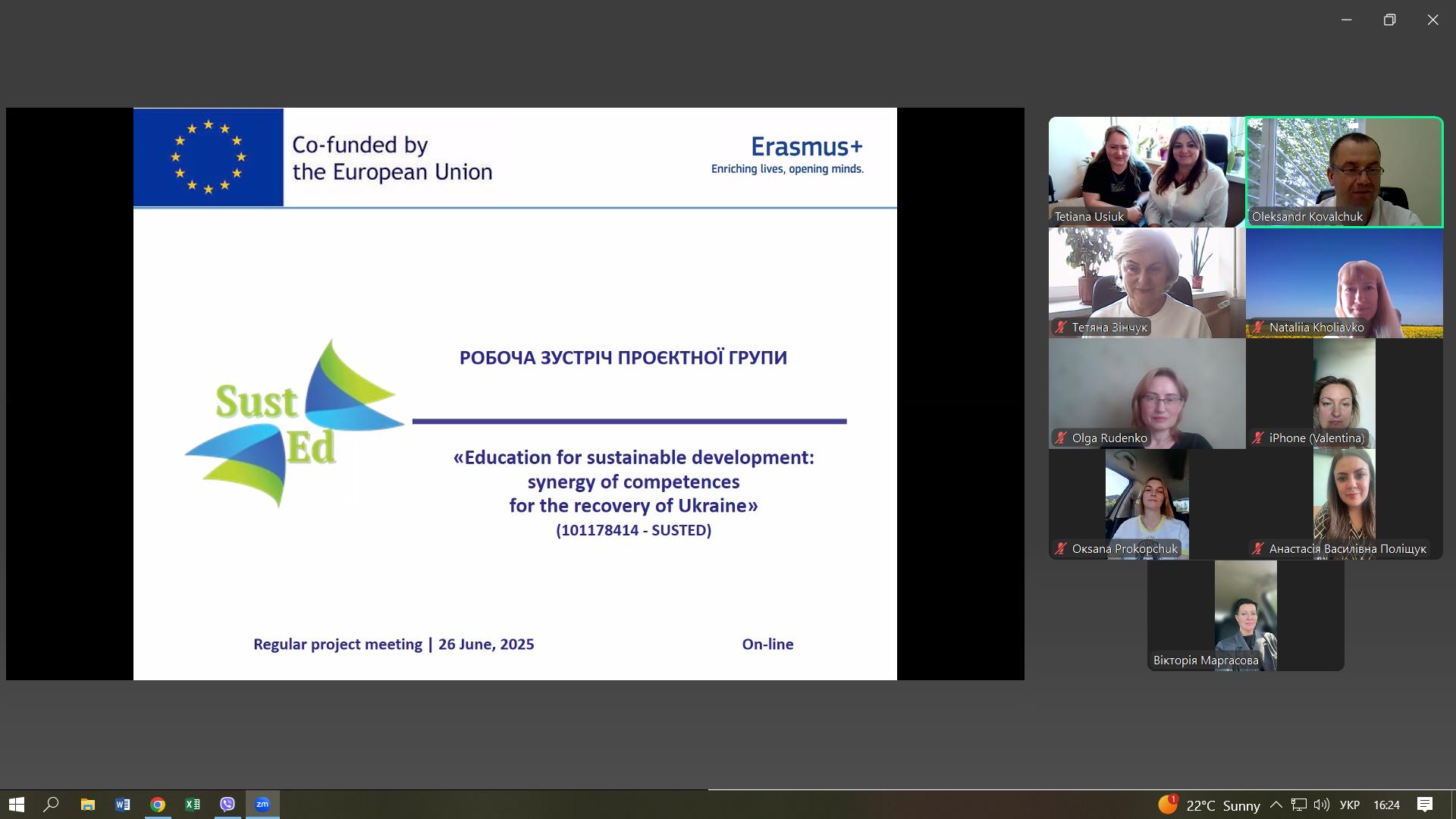 26 червня 2025 року в рамках реалізації міжнародного проєкту Erasmus+ The Capacity Building in Higher Education (CBHE) SUSTED – «Освіта для сталого розвитку: синергія компетенцій для відновлення України» відбулася чергова робоча онлайн-зустріч представників Закладу вищої освіти «Подільський державний університет» з координатором (Поліський національний університет) та партнерами проєкту.