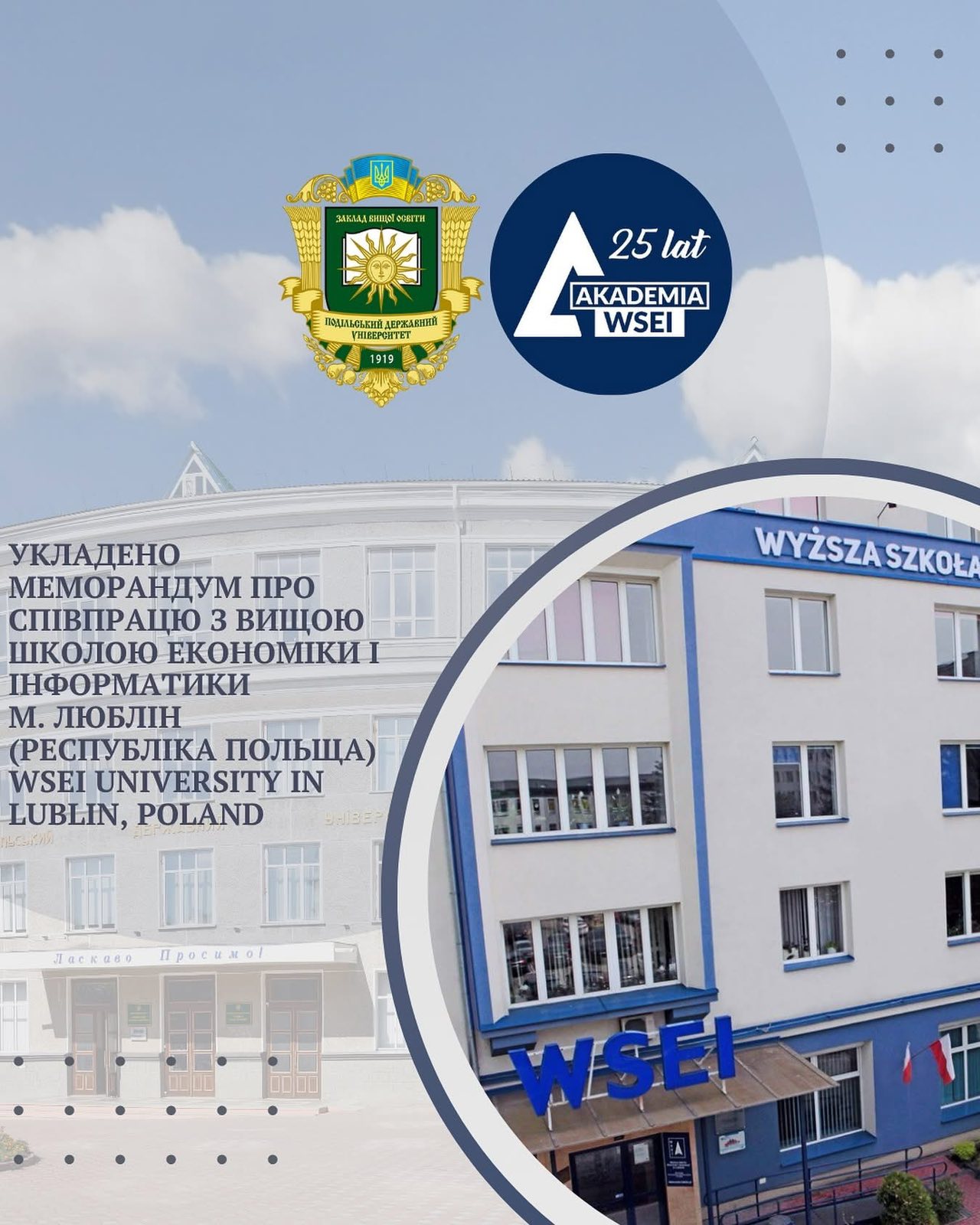 Закладом вищої освіти «Подільський державний університет» укладено меморандум про співпрацю з Вищою школою економіки і інформатики м. Люблін (Республіка Польща) WSEI UNIVERSITY IN LUBLIN, POLAND.