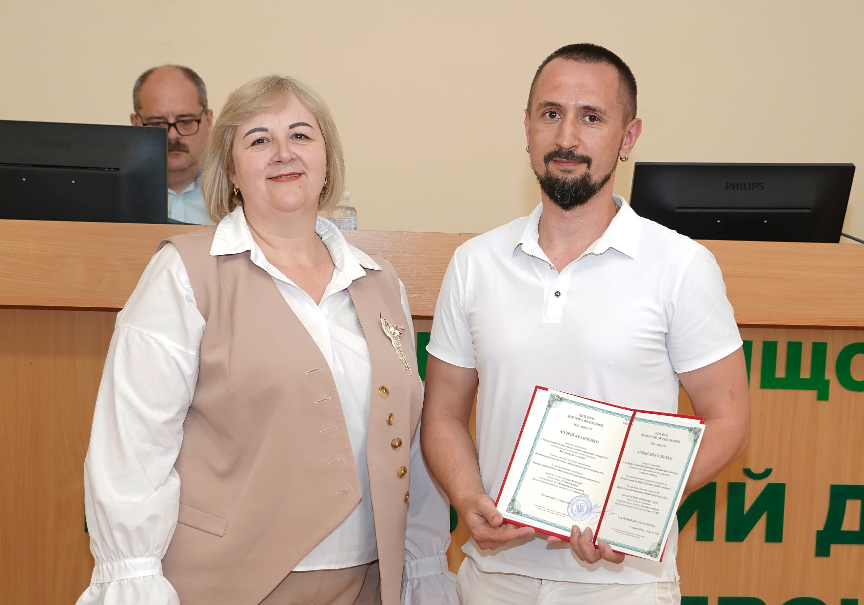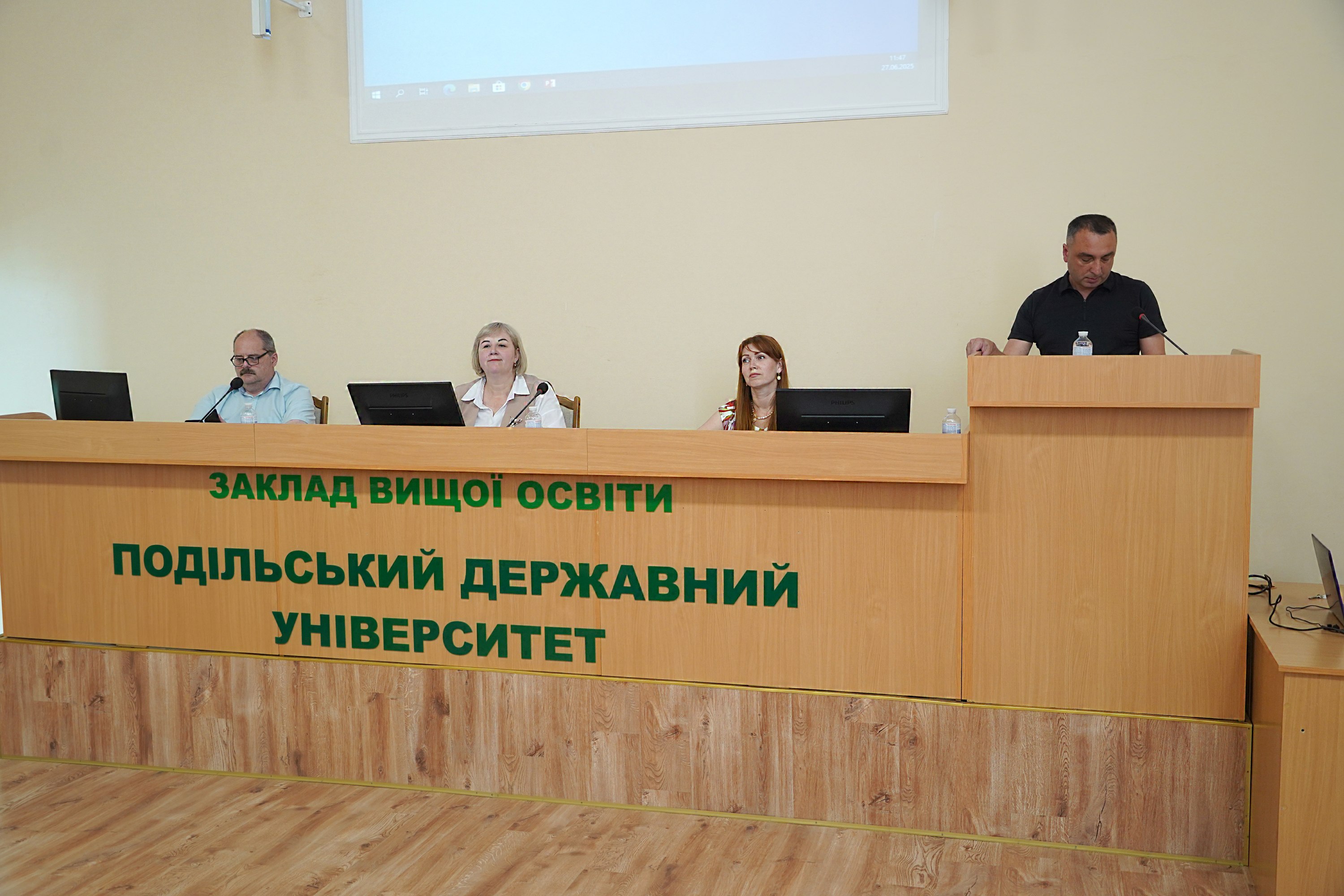 Сьогодні, 27 червня 2025 року, відбулося планове засідання Вченої ради Закладу вищої освіти «Подільський державний університет», в якому взяли участь 56 членів ради із 67. Перед початком засідання голова Вченої ради університету, професор Алла ІВАНОВСЬКА привітала декана факультету ветеринарної медицини та технологій у тваринництві Віктора ГОРЮКА з днем народження і побажала йому здоров’я, благополуччя та плідної роботи на благо університету. Також, Алла Миколаївна вручила диплом доктора філософії з галузі знань 21 Ветеринарія за спеціальністю 211 Ветеринарна медицина Андрію КРАВЧЕНКУ.