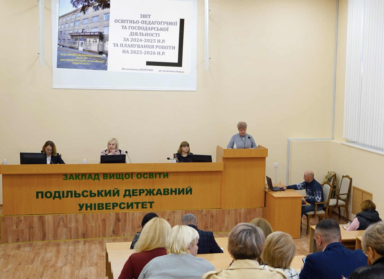 31 жовтня 2025 року відбулося планове засідання Вченої ради Закладу вищої освіти «Подільський державний університет». Голова Вченої ради Закладу вищої освіти «Подільський державний університет», професор Алла ІВАНОВСЬКА привітала з ювілеєм доктора педагогічних наук, кандидата технічних наук, заслуженого працівника освіти, завідувача кафедри, професора ДУГАНЦЯ Віктора Івановича.