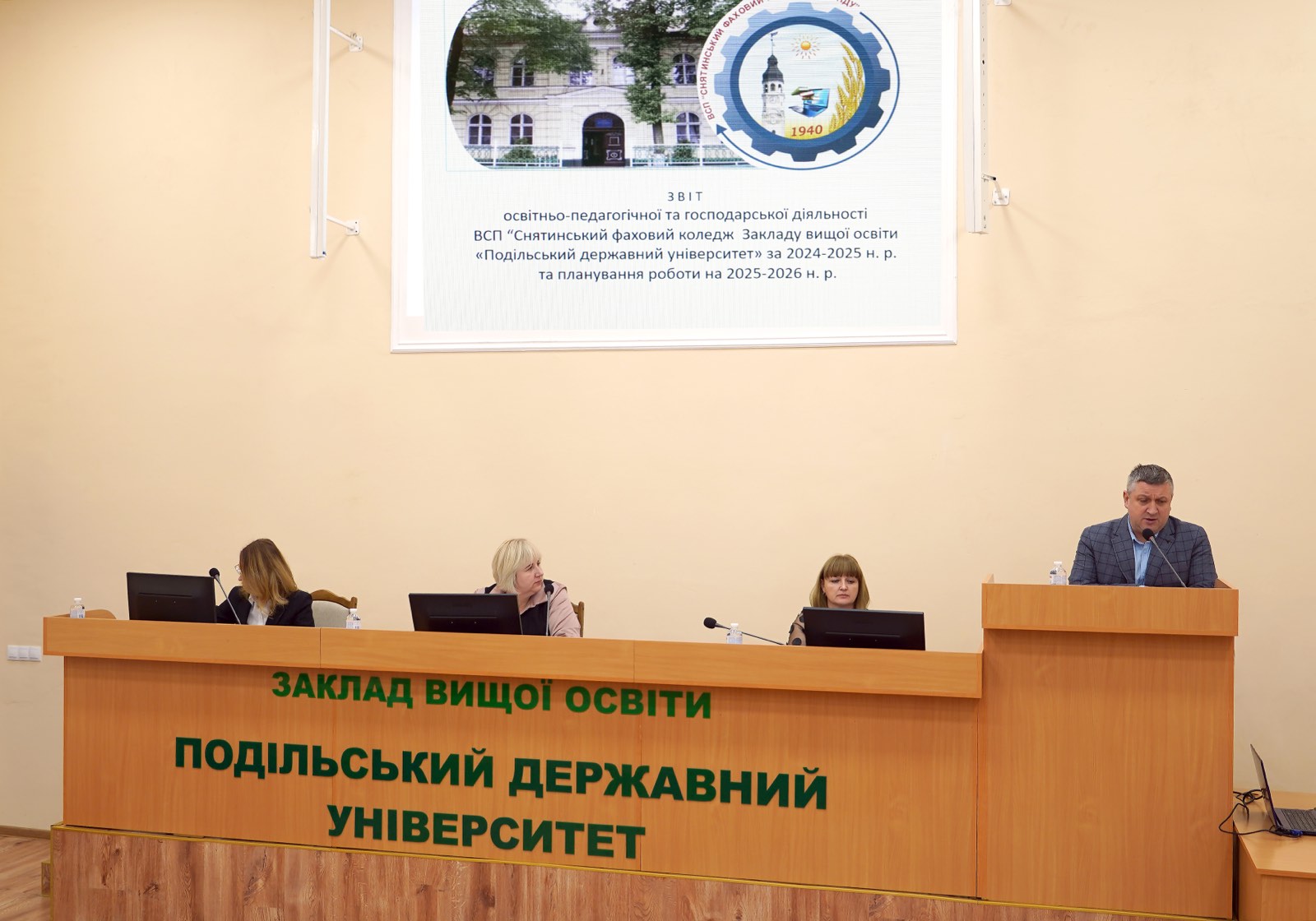Про звіти за підсумками освітньо-педагогічної та господарської діяльності ВСП ЗВО «ПДУ», а також планування роботи на 2025-2026 н. р. доповіли: директор ВСП «Бучацький фаховий коледж ЗВО «ПДУ», кандидат економічних наук, ЛЕСЬКІВ Ігор Юрійович, в.о. директора ВСП «Новоушицький фаховий коледж ЗВО «ПДУ» ХРУСТІНСЬКИЙ Віталій Борисович, директор ВСП «Шепетівський фаховий коледж ЗВО «ПДУ» ДМИТРИК Валентина Володимирівна, директор ВСП «Снятинський фаховий коледж ЗВО «ПДУ», кандидат фізико-математичних наук, КАЛИТЧУК Іван Васильович, директор ВСП «Кіцманський фаховий коледж ЗВО «ПДУ» БІЛЯР Іван Георгійович, директор ВСП «Хотинський фаховий коледж ЗВО «ПДУ» ЮЗЬКО Володимир Іванович, директор ВСП «Кам’янець-Подільський фаховий коледж ЗВО «ПДУ», кандидат економічних наук, БІЛЯНСЬКИЙ Юрій Олександрович.