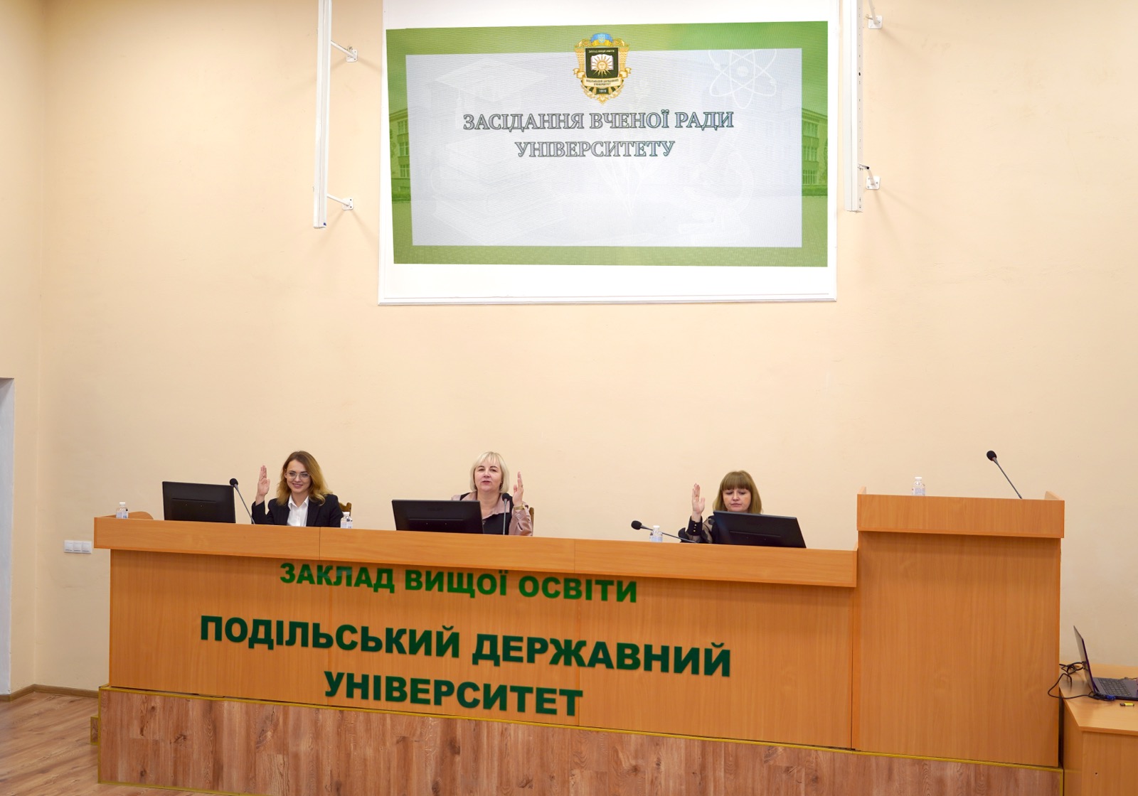 На засіданні Вченої ради розглянуто й прийнято рішення про: призначення наукових керівників здобувачам третього (освітньо-наукового) рівня вищої освіти ступеня доктора філософії 2025 року вступу денної форми навчання (за кошти державного бюджету) та затвердження індивідуального плану наукової роботи докторанта; затвердження рекомендацій про направлення на міжнародне науково-педагогічне стажування за премією Івана Виговського та індивідуального плану роботи стажування на 2025-2026 н. р. доцента КУЧЕРА Олега Володимировича; затвердження звіту про проходження закордонного стажування ТКАЧ Лілії Вікторівни; рекомендації до видання навчального посібника «Фактори агротехнологій в рослинництві» авторів професора ГОРАША Олександра Савича та доцента КЛИМИШЕНОЇ Ріти Іванівни; опублікування електронного збірника матеріалу І Міжнародної науково-практичної інтернет-конференції «Сучасні технології та технічний сервіс: виклики та перспективи»; питання складу Ради молодих учених Закладу вищої освіти «Подільський державний університет».