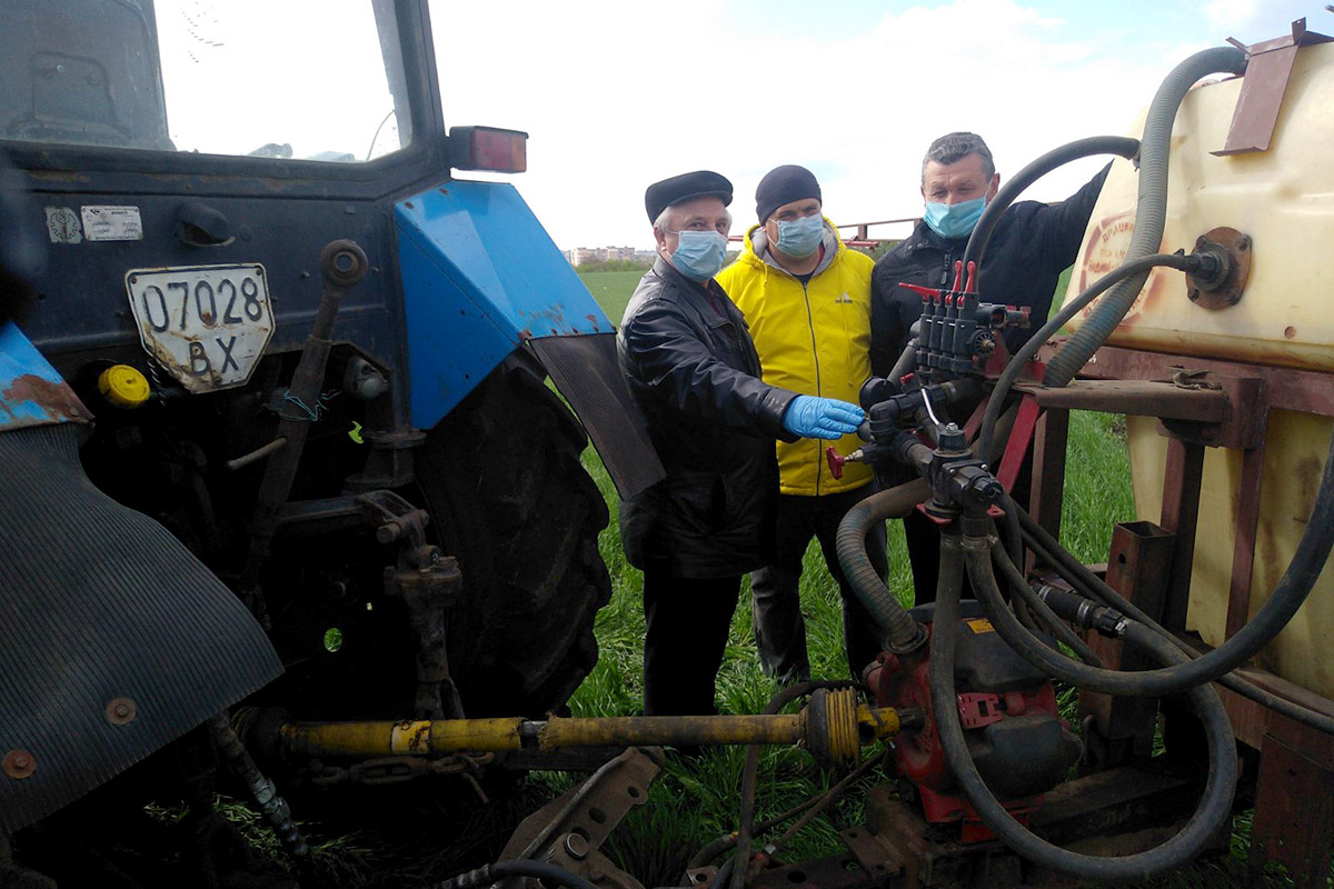 Завідувач кафедри, доцент Анатолій Володимирович Рудь, доцент Юрій Федорович Павельчук і технік першої категорії Іван Остапович Мошенко підготували машинно-тракторний агрегат в складі трактора МТЗ-82 і польового обприскувача ОП-2000-01, обладнаного розпилюючою системою фірми Hardi.