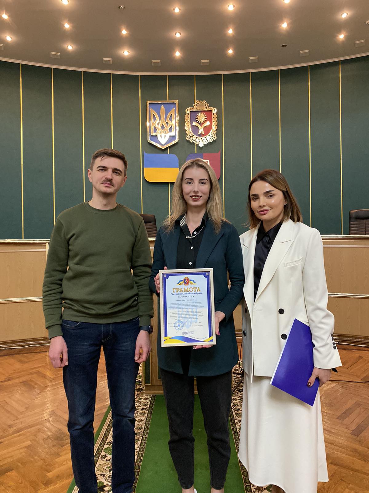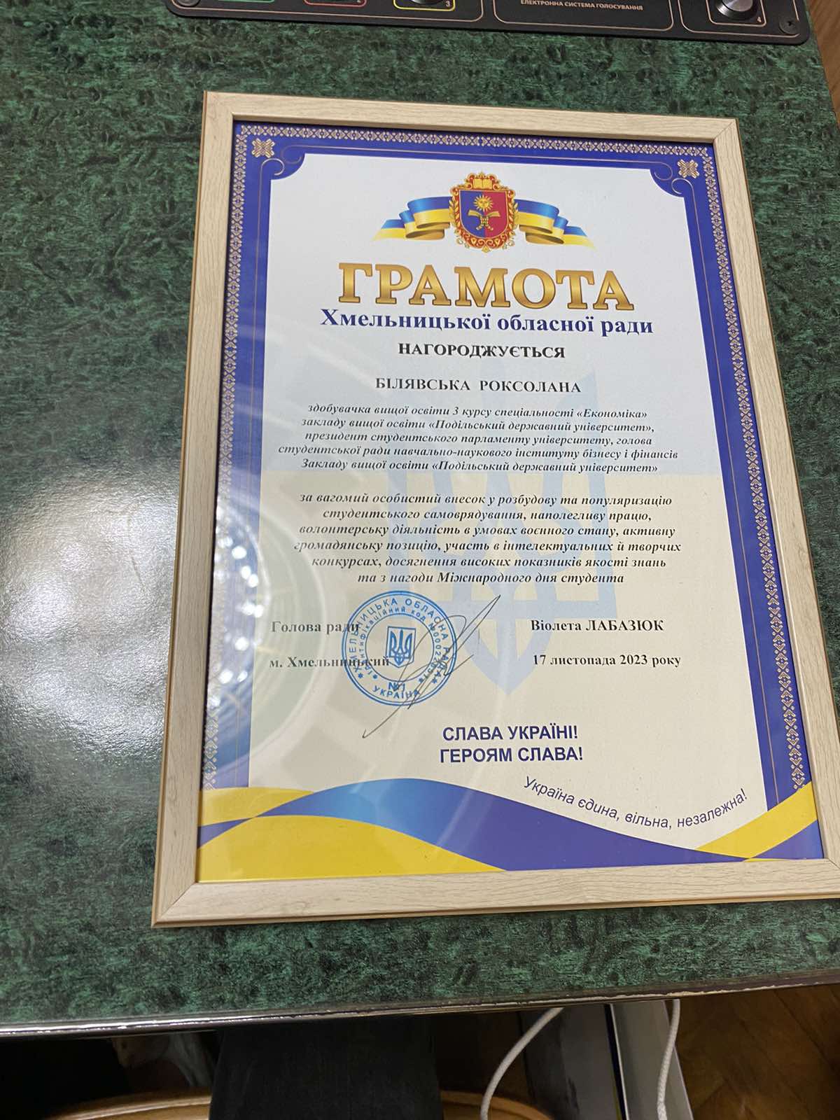 Голова обласної ради Віолета ЛАБАЗЮК відзначила Грамотою Хмельницької обласної ради Президента студентського парламенту Закладу вищої освіти «Подільський державний університет» Роксолану БІЛЯВСЬКУ за вагомий особистий внесок у розбудову та популяризацію студентського самоврядування, наполегливу працю, волонтерську діяльність в умовах воєнного стану, активну громадянську позицію, участь в інтелектуальних й творчих конкурсах, досягнення високих показників якості знань та з нагоди Міжнародного дня студента.
