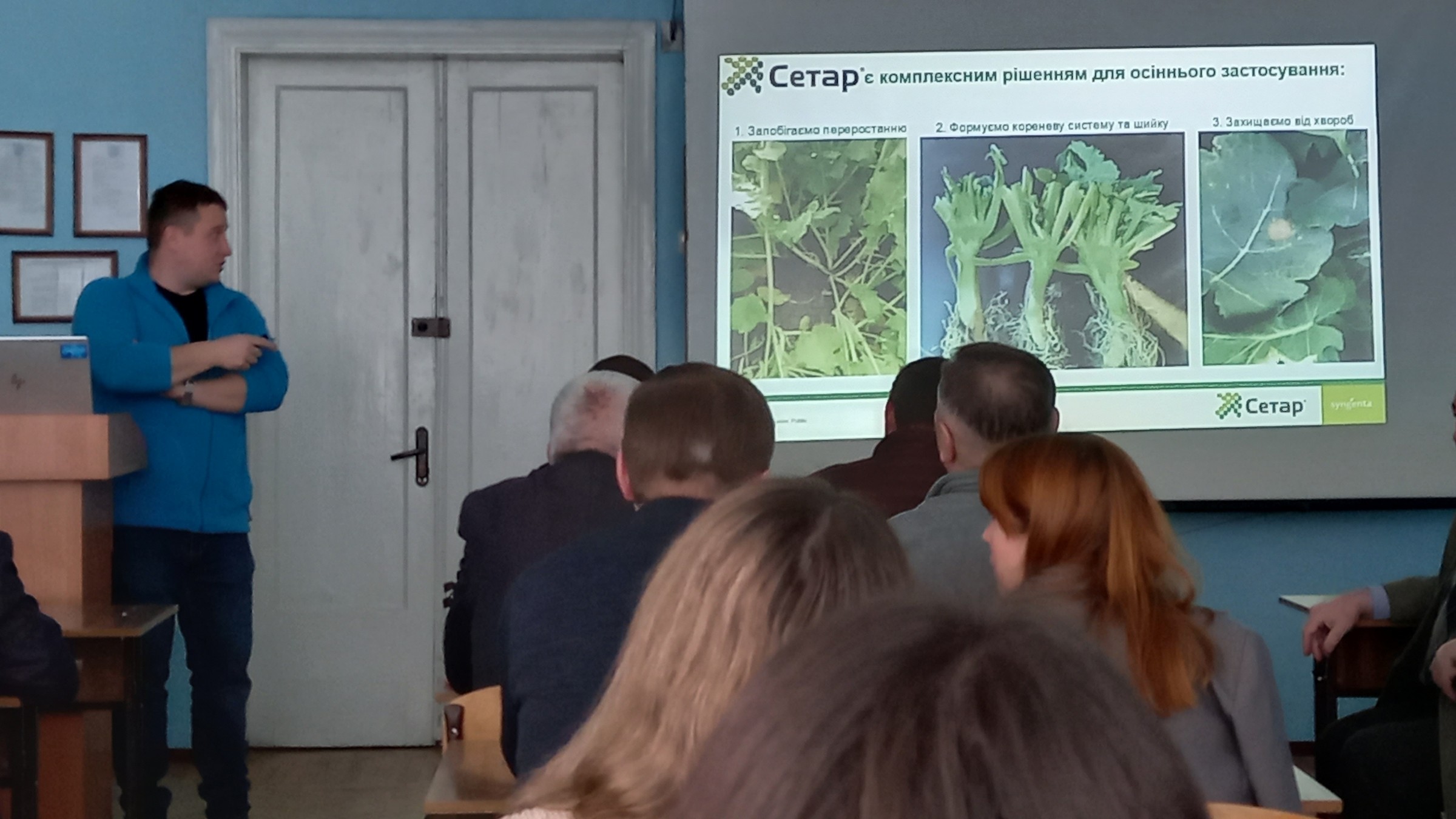Спікер (технічний експерт компанії ТОВ“Сингента”) Юрій Парфенюк – розповів про нові сучасні продукти команії. Жваві дискусії викликали питання застосування інгібіторів росту на посівах ріпаку та соняшнику. Особлиий інтерес викликала презентація фунгіциду Міравіс Нео, що містить три діючі речовини з трьох хімічних груп (карбоксаміди, стробілурини, триазоли) та здатний контролювати хвороби листя та колосу пшениці озимої.
