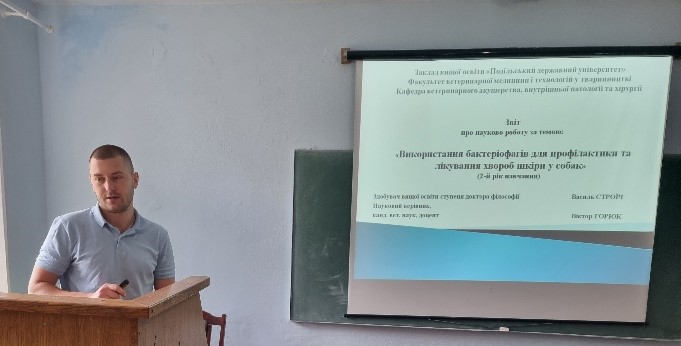 20 вересня 2023 року відбулася атестація аспірантів всіх років та форм навчання на розширеному міжкафедральному семінарі факультету ветеринарної медицини і технологій у тваринництві. Розпочала захід вступним словом проректор з навчальної, науково-інноваційної та міжнародної діяльності Оксана БЯЛКОВСЬКА та відмітила, що звітування про свою роботу для аспіранта - вагома нагода представити себе та завершити ще один із етапів роботи, а значить продовжувати і реалізовувати завдання щодо поставленої мети. У доповідях взяли участь: Василь БАНДУРА, аспірант 1 року навчання кафедри гігієни тварин та ветеринарного забезпечення кінологічної служби Національної поліції України, науковий керівник докторка с.г.наук, професорка Тетяна СУПРОВИЧ; Ігор ЛЕСЮК, аспірант 1 року навчання кафедри ветеринарного акушерства, внутрішньої патології та хірургії, науковий керівник к.біол.н. доцент Олександр БОДНАР; Андрій КРАВЧЕНКО, аспірант 2 року навчання кафедри інфекційних та інвазійних хвороб, науковий керівник докторка вет.наук, доцентка Вікторія ЛЕВИЦЬКА; СТРОЇЧ Василь аспірант 3 року навчання кафедри ветеринарного акушерства, внутрішньої патології та хірургії науковий керівник к.вет.н., доцент ГОРЮК Віктор; Михайло МОЧЕРНЮК, аспірант 3 року навчання кафедри ветеринарного акушерства, внутрішньої патології та хірургії, науковий керівник докторка вет.наук, доцентка Юлія ГОРЮК; Лілія СТРОЯНОВСЬКА, аспірантка 3 року навчання кафедри гігієни тварин та ветеринарного забезпечення кінологічної служби Національної поліції України, науковий керівник докторка с.г.наук, професорка Тетяна СУПРОВИЧ; Владислав КОЖИН, аспірант 4 року навчання кафедри ветеринарного акушерства, внутрішньої патології та хірургії, науковий керівник к.вет.н., доцент ГОРЮК Віктор. Окрім представлених звітів, дискусія під час зібрання велася у формі діалогу. Молоді науковці обмінювалися досвідом та спілкувалися з науковими керівниками.