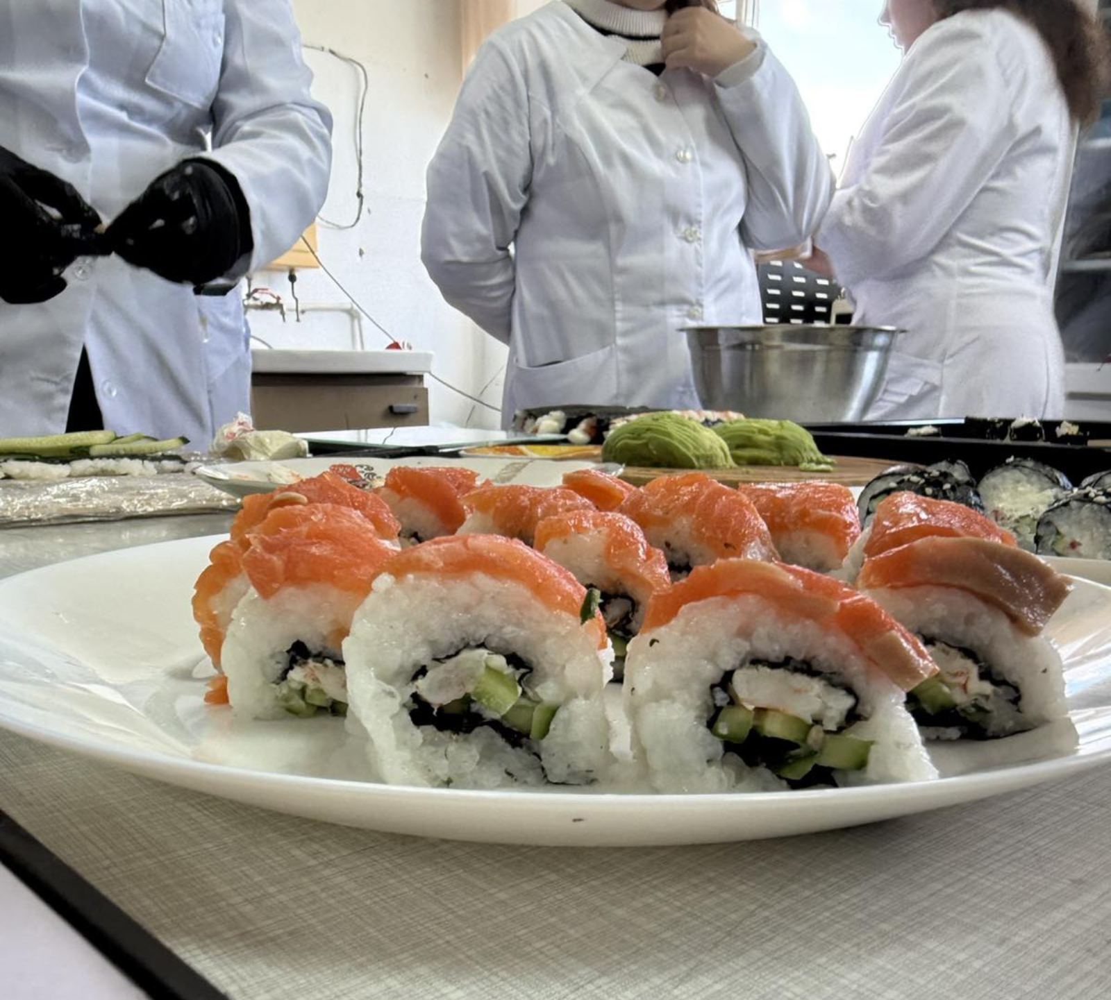 Так, здобувачі навчились готувати рис спеціальних сортів із підвищеним вмістом клейковини різними способами. Важливим компонентом до рису є заправка з рисового оцту, цукру і солі, приготована за спеціальною рецептурою. Також під час майстер-класу здобувачі вивчили процес підготовки і нарізання риби, морепродуктів (лосось, креветки); нарізання овочів (огірок, авокадо); формування ролів; подачі додаткових компонентів (соєвого соусу, маринованого імбиру). На початку робочого процесу здобувачі провели органолептичну оцінку усіх продуктів. Це не лише навчає згуртованій системній роботі, а й створює дружню атмосферу, наповнену задоволенням від спільного результату. Вивчення мистецтва приготування суші — це не просто майстер-клас, а й маленьке зростання кожного здобувача як фахівця. Творчий підхід та експерименти у роботі дозволяють проявити фантазію та індивідуальність кожного учасника.