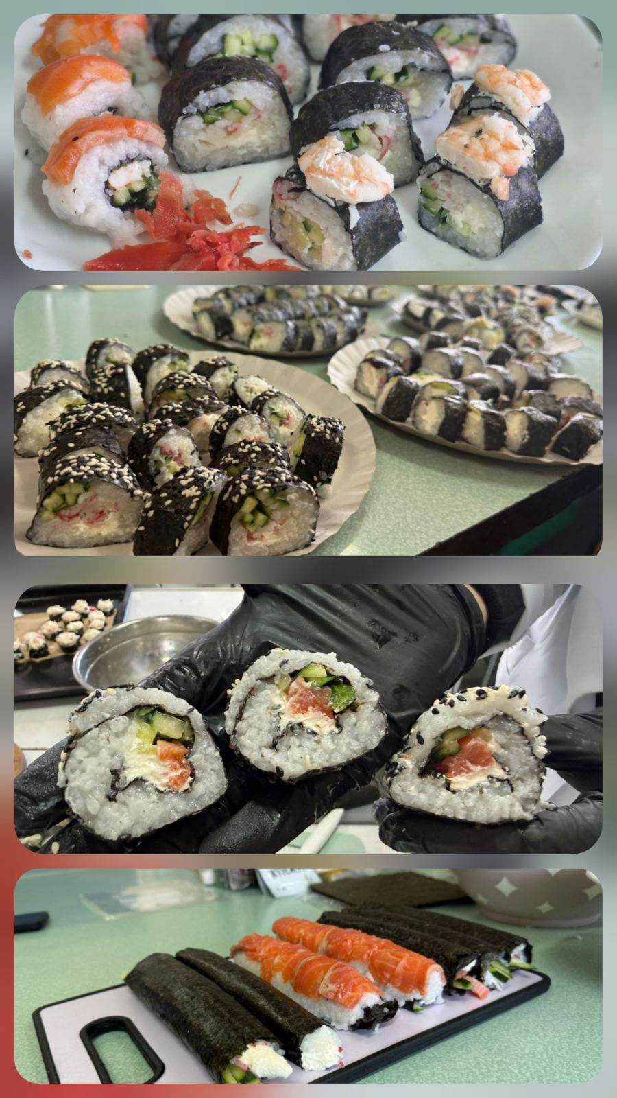 Заняття, на яких здобувачі власноруч практикують відпрацювання різних технологічних прийомів, як от приготування суші, стають не лише захопливою формою занять, а й реальним практичним досвідом. Передусім молодь дізналася про історію походження суші, види ролів, способи і техніку нарізання риби, овочів, правила поєднання смаків та правильне оформлення страви. Такі майстер-класи розвивають уважність, акуратність і відчуття гармонії — як у смаку, так і в подачі. Суші — це традиційна страва японської кухні, що набула широкої популярності у всьому світі. Основними інгредієнтами є: відварений рис, приправлений оцтовою заправкою; риба, морепродукти; овочі, водорості норі, тощо. Технологічний процес приготування суші передбачає послідовність операцій, які забезпечують отримання безпечного, естетично привабливого та органолептично збалансованого продукту.
