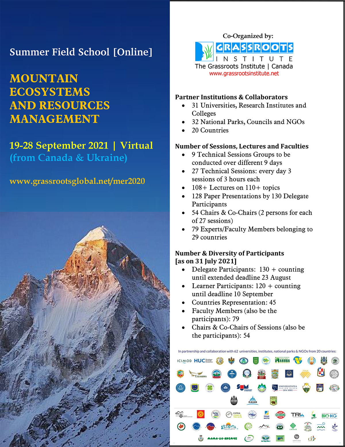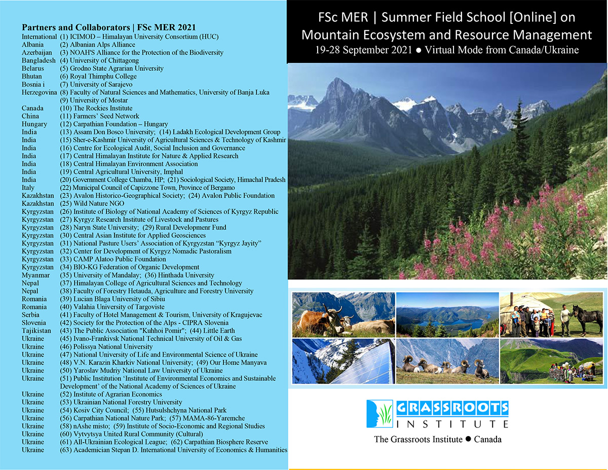 Шановні колеги та студенти! З радістю повідомляємо про продовження терміну реєстрації делегатів до Міжнародної літньої польової школи з гірських екосистем та управління ресурсами (до 23.08.21), організовану міжнародною корпорацією Grassroots Institute (Канада) та 63 партнерами (університетами, науково - дослідними інститутами, національними парками та громадськими організаціями більше 20 країн), серед яких ГО «Інститут соціально-економічних регіональних досліджень»