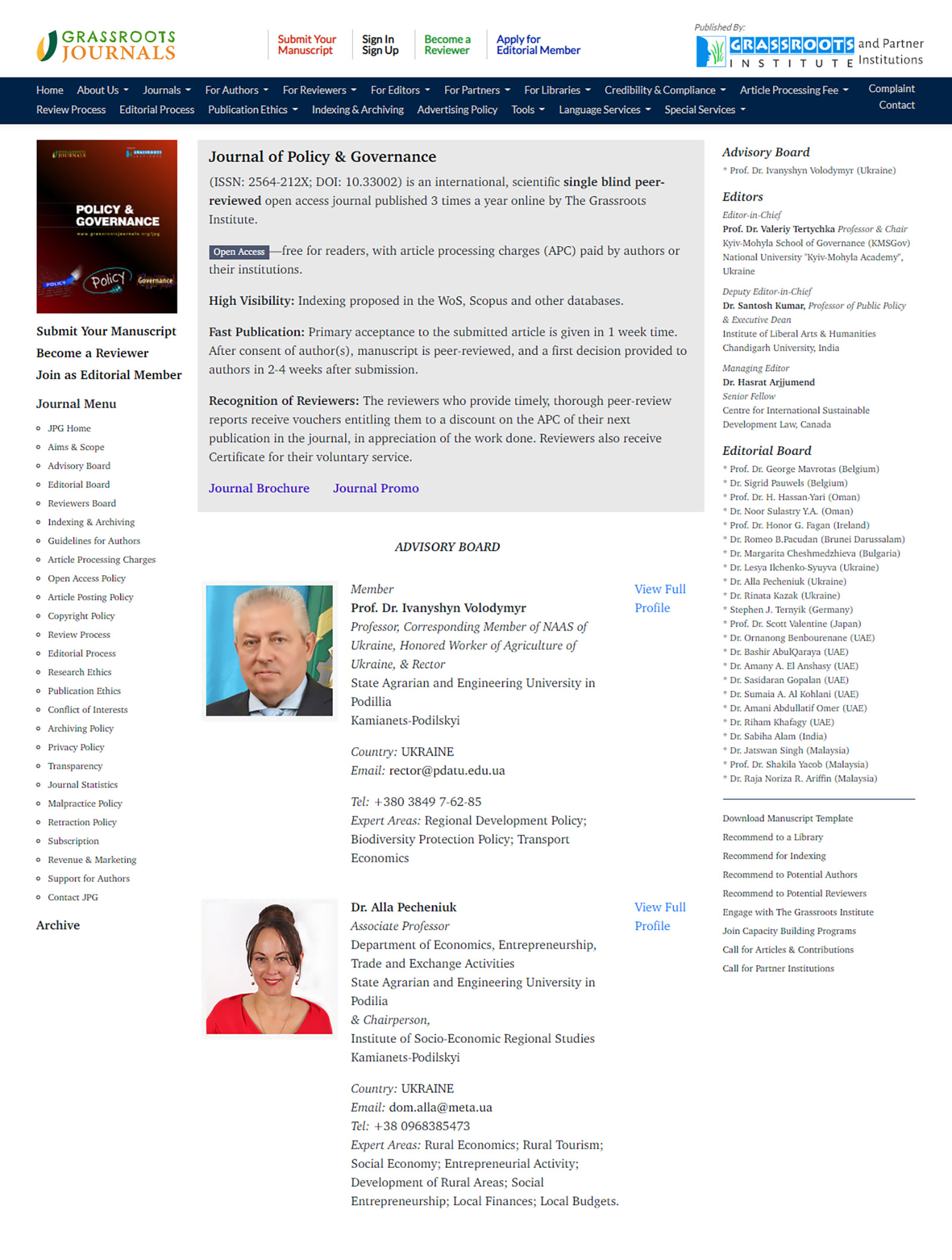 Колективи Подільського державного аграрно-технічного університету і громадської організації «Інститут соціально-економічних регіональних досліджень» щиро вітають доктора економічних наук, професора, член -кореспондента НААН України, заслуженого працівника сільського господарства України, ректора Подільського державного аграрно-технічного університету Володимира ІВАНИШИН з обранням до міжнародної науково-консультативної ради журналу «Політика і урядування» (Journal of Policy & Governance), який видається корпорацією Grassroots Institute (Канада)!