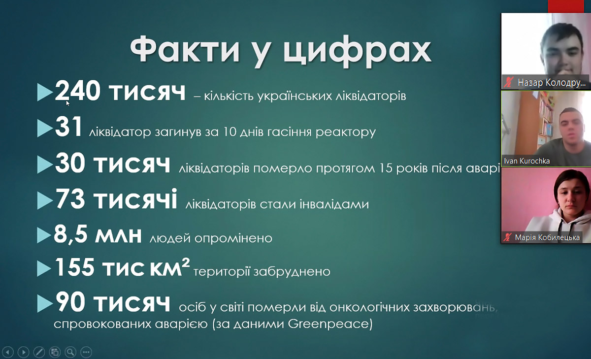 У ПДАТУ з нагоди 35-річчя від дня Чорнобильської трагедії відбулося дистанційне засідання круглого столу «Чорнобиль: 35 років пам'яті…», організованого кафедрою нормальної та патологічної морфології і фізіології, за участю директора Центру виховної роботи і соціально-культурного розвитку Куземи А.Л., фахівців Центру Ітомліної-Напорчук А.Г., Українець Н.В., голови профкому співробітників та студентів Ліщук С.Г., викладачів кафедри НПМіФ Цвігуна О.А., Савчук Л.Б, Добровольського В.А., Каспрова Р.В.,Чепурної В.А., Пливанюка Є.В., та кафедри теоретико-правових і соціально-гуманітарних дисциплін Колосюк І.А., представників студентського Парламенту університету.