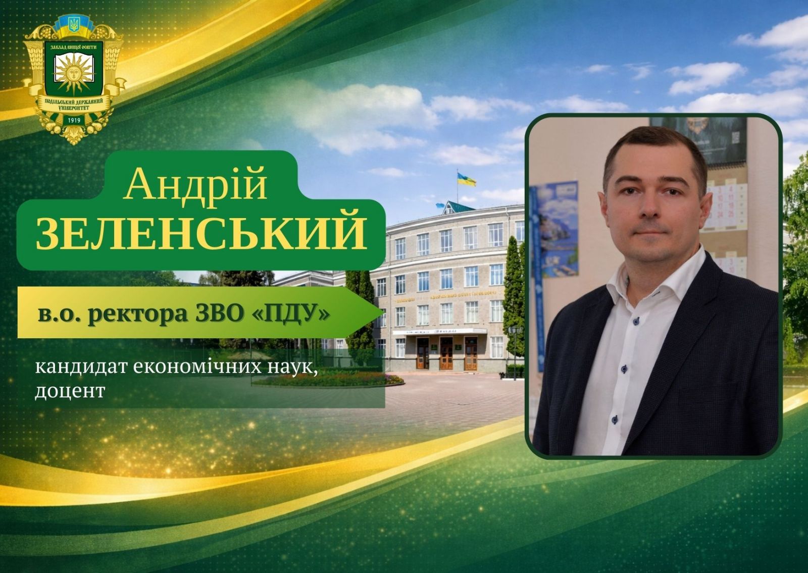 Відповідно до наказу Міністерства освіти і науки України № 134-к-26 з 10 березня 2026 року виконувачем обов’язків ректора Закладу вищої освіти «Подільський державний університет» призначено кандидата економічних наук, доцента Андрія Вікторовича ЗЕЛЕНСЬКОГО.