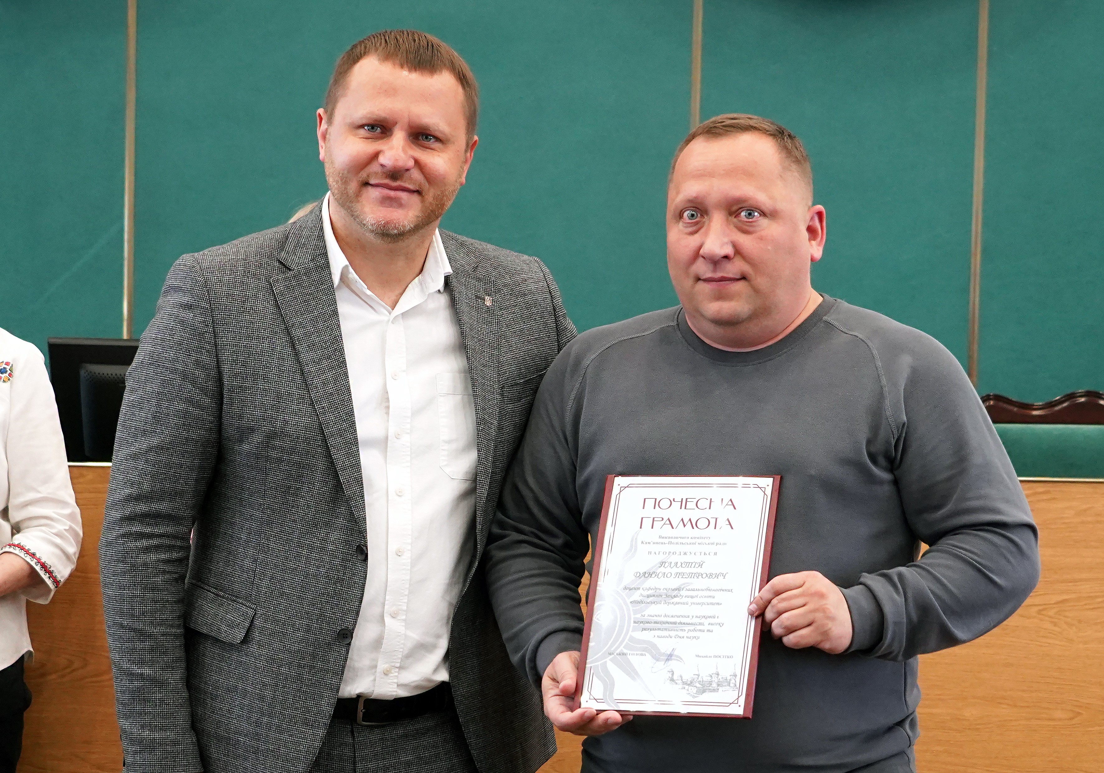 За досягнення в науковій і науково-технічній діяльності, високу результативність роботи та з нагоди Дня науки міський голова нагородив грамотами представників Закладу вищої освіти «Подільський державний університет»: доцента кафедри екології і загальнобіологічних дисциплін Данила ПЛАХТІЯ та Миколу КОРЧАКА – доцента кафедри агроінженерії і системотехніки імені Михайла САМОКИША.