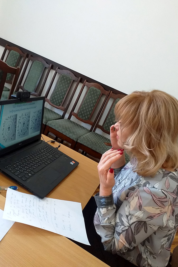 Голова профкому ПДУ, асистент кафедри НПМ і Ф, ФВМ і ТТ Ліщук Світлана актуалізувала тему медіа-грамотності та кібер-соціалізації. Доповідачка наводила приклади поширення фейкової інформації та способи реагування на неї.