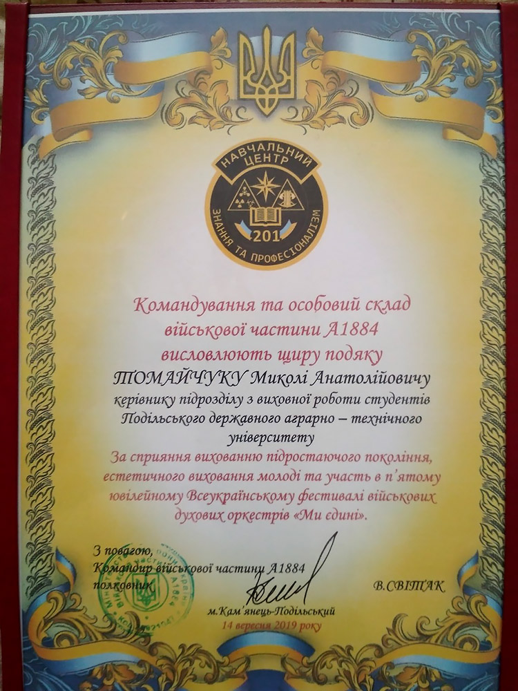Подільський державний аграрно-технічний університет представляв керівник з підрозділу виховної роботи студентів Микола Томайчук. Було представлено музично-хореографічну композицію, за що був нагороджений подякою від командування та особового складу військової частини А1884.