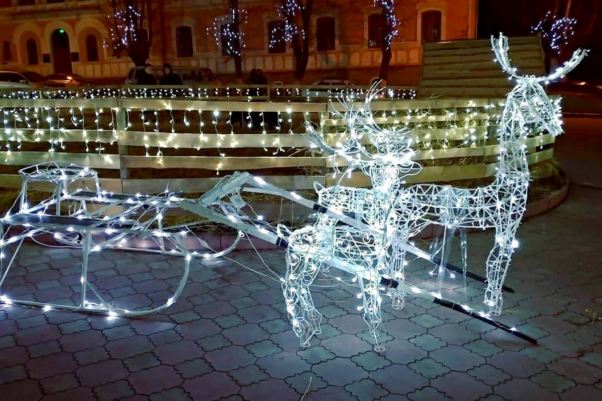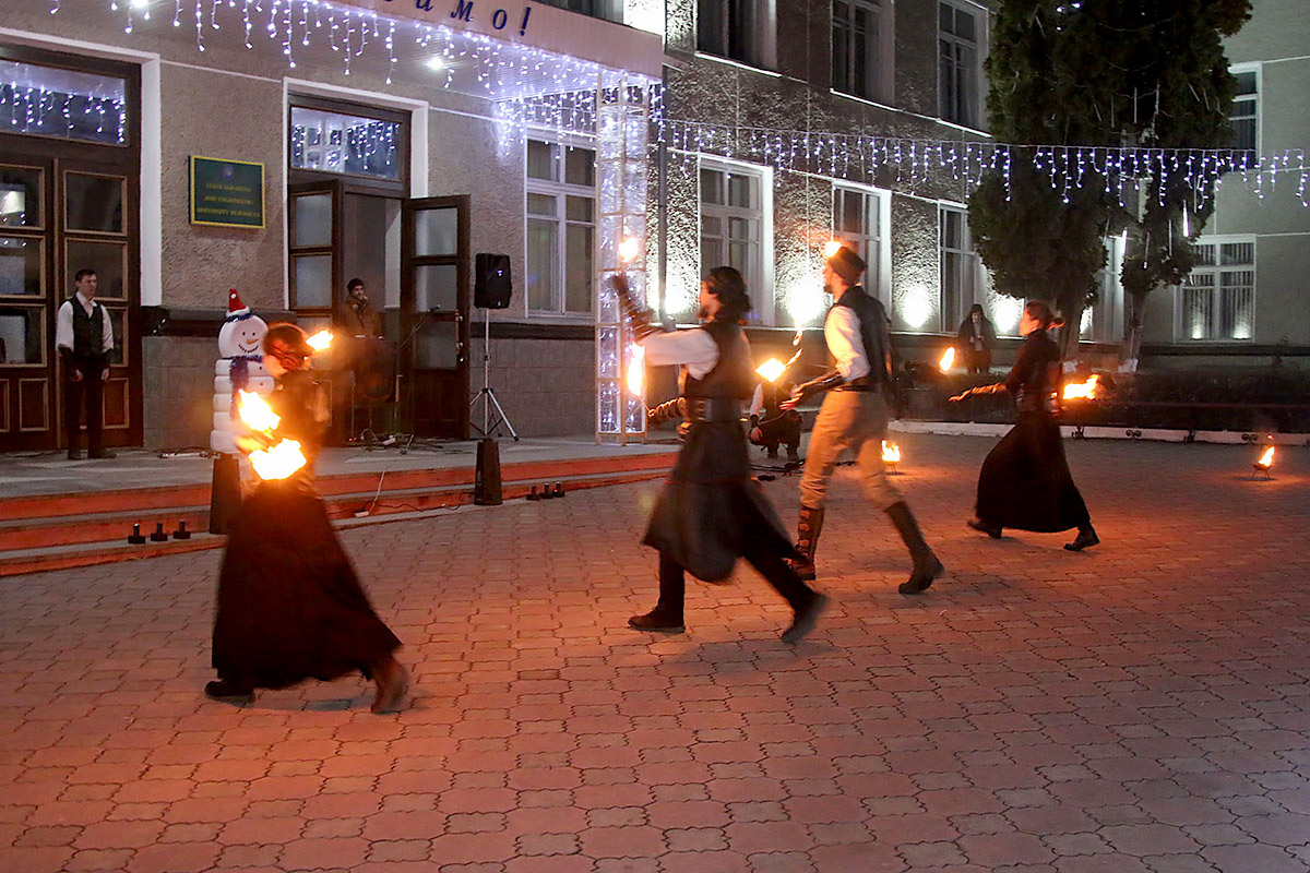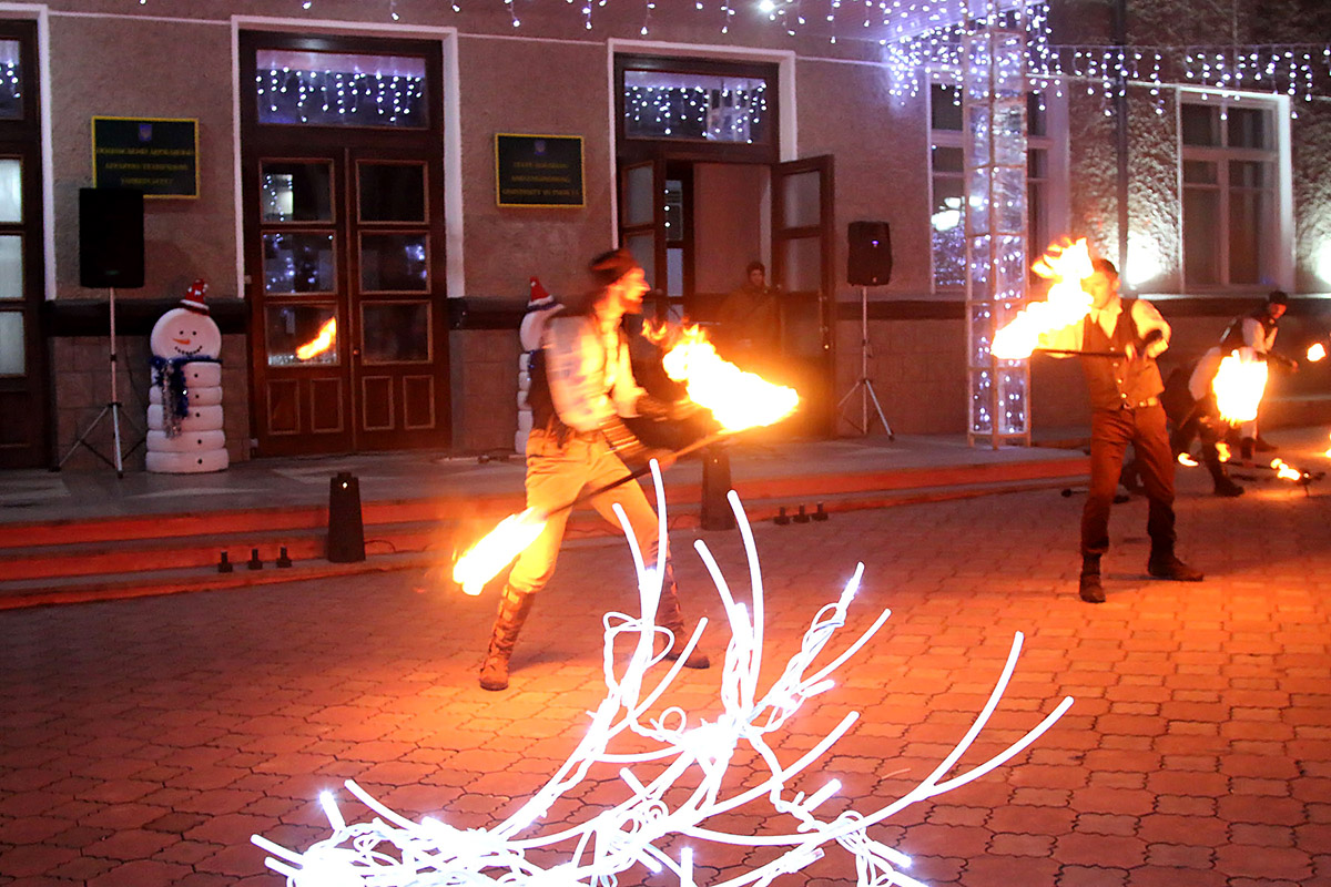 Уся площа біля головного корпусу засяяла святковими вогнями та ілюмінаціями, оригінальними новорічними інсталяціями: дерева, кущі та сама будівля виблискували різнокольоровими вогниками, відтворення новорічно-різдвяного вертепу із маленьким Ісусиком у яслах та вівцями, мигаючим тракторцем, блискучою кулею. Саме приміщення всередині не менш виблискувало кольоровими барвами, новорічною фотозоною, сніговиками, а красуня-ялинка, що прикрашала актову залу подарувала усім святковий настрій.