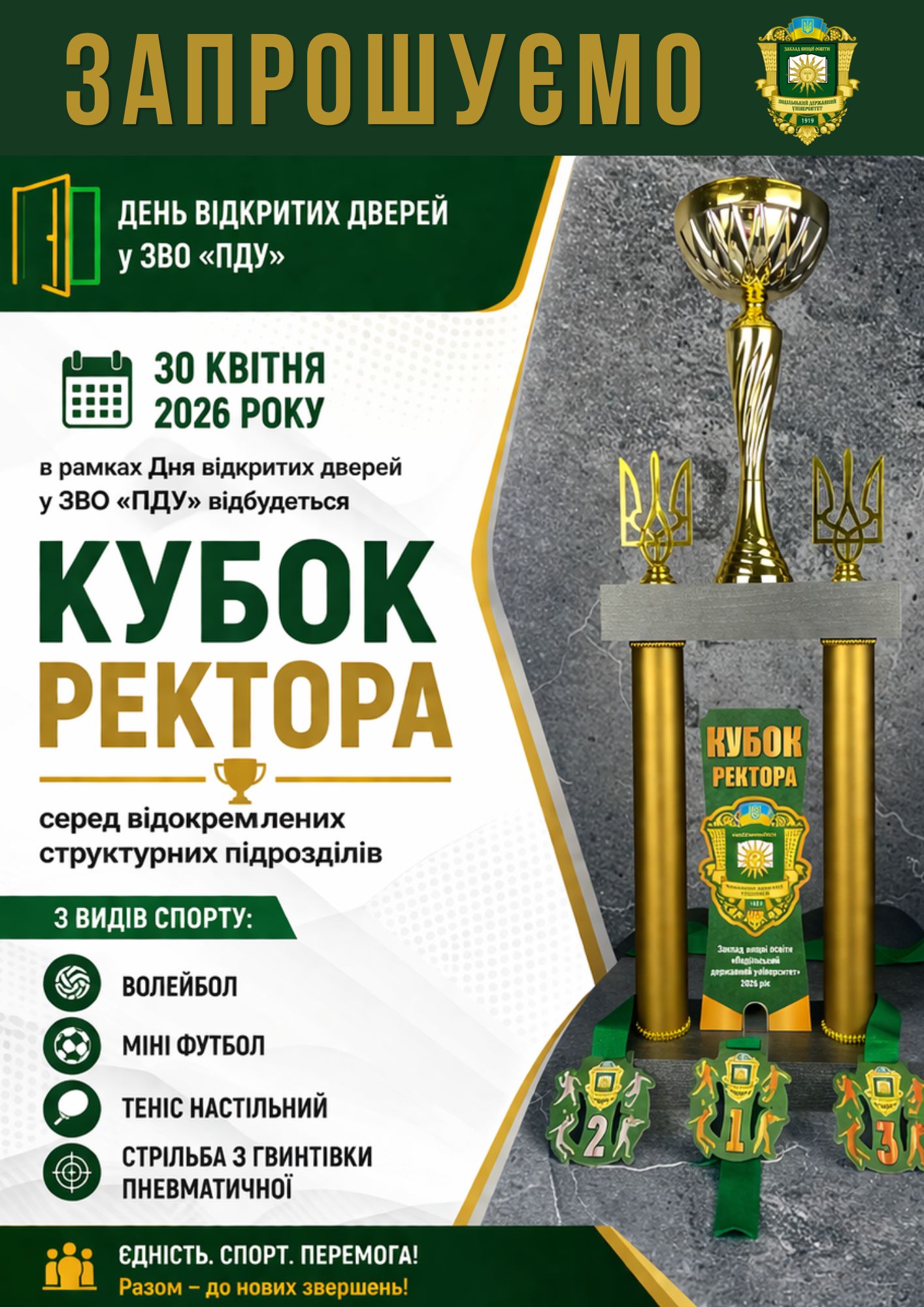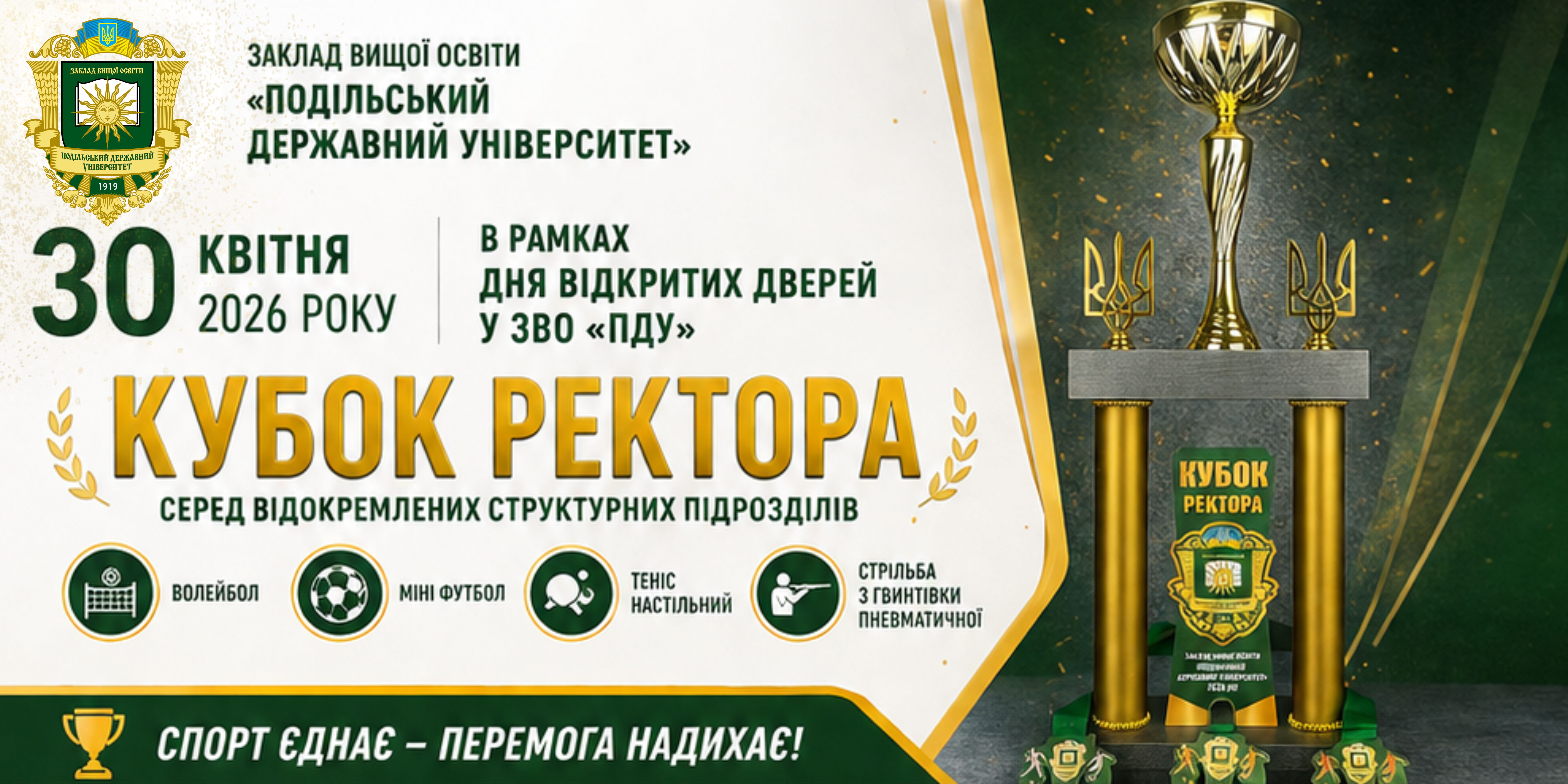 30 квітня 2026 року в рамках Дня відкритих дверей у Закладі вищої освіти «Подільський державний університет» відбудеться Кубок ректора серед відокремлених структурних підрозділів.