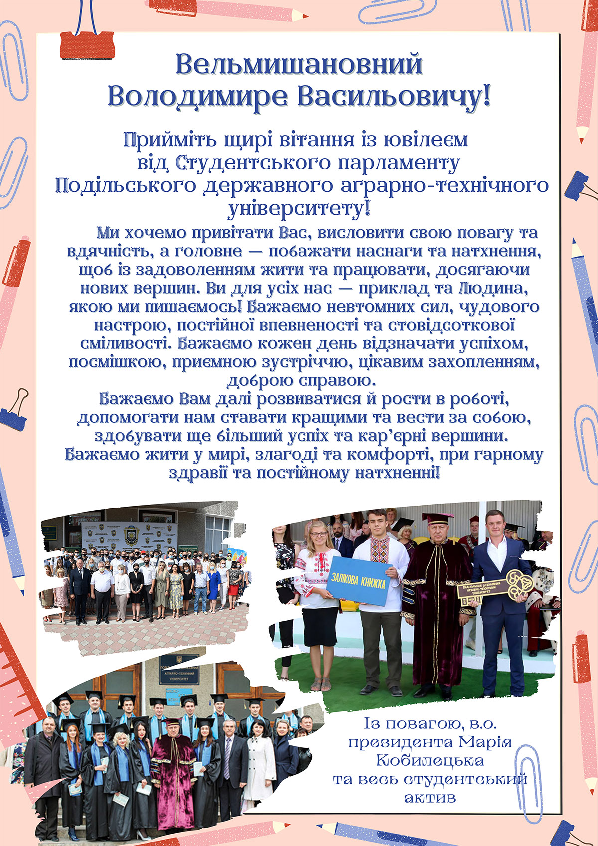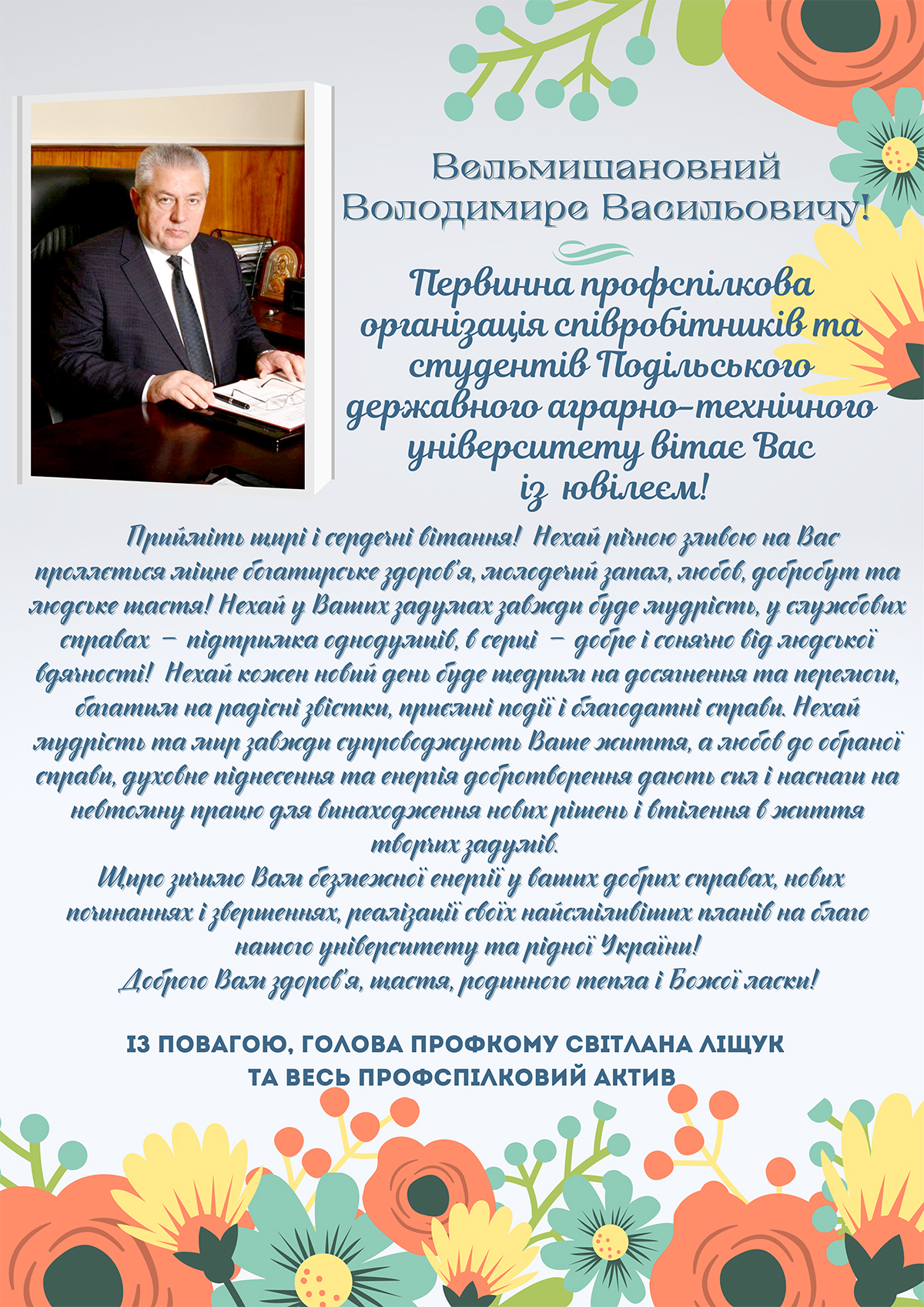 Профком та студентське самоврядування ПДАТУ вітають ректора Володимира Васильовича Іванишин з ювілеєм!