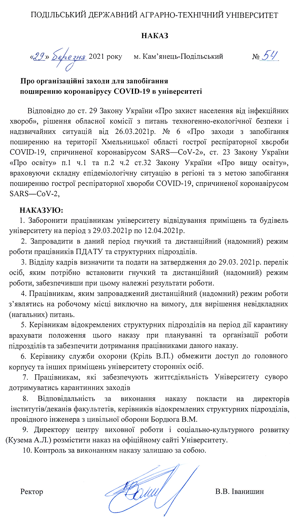 Наказ №54 від 29 березня 2021 року «Про організаційні заходи для запобігання поширенню коронавірусу COVID-19 в університеті»