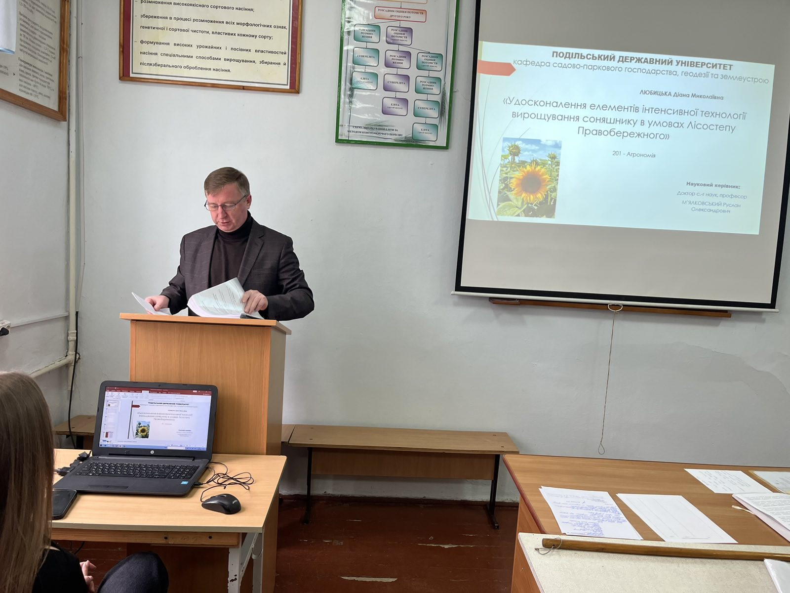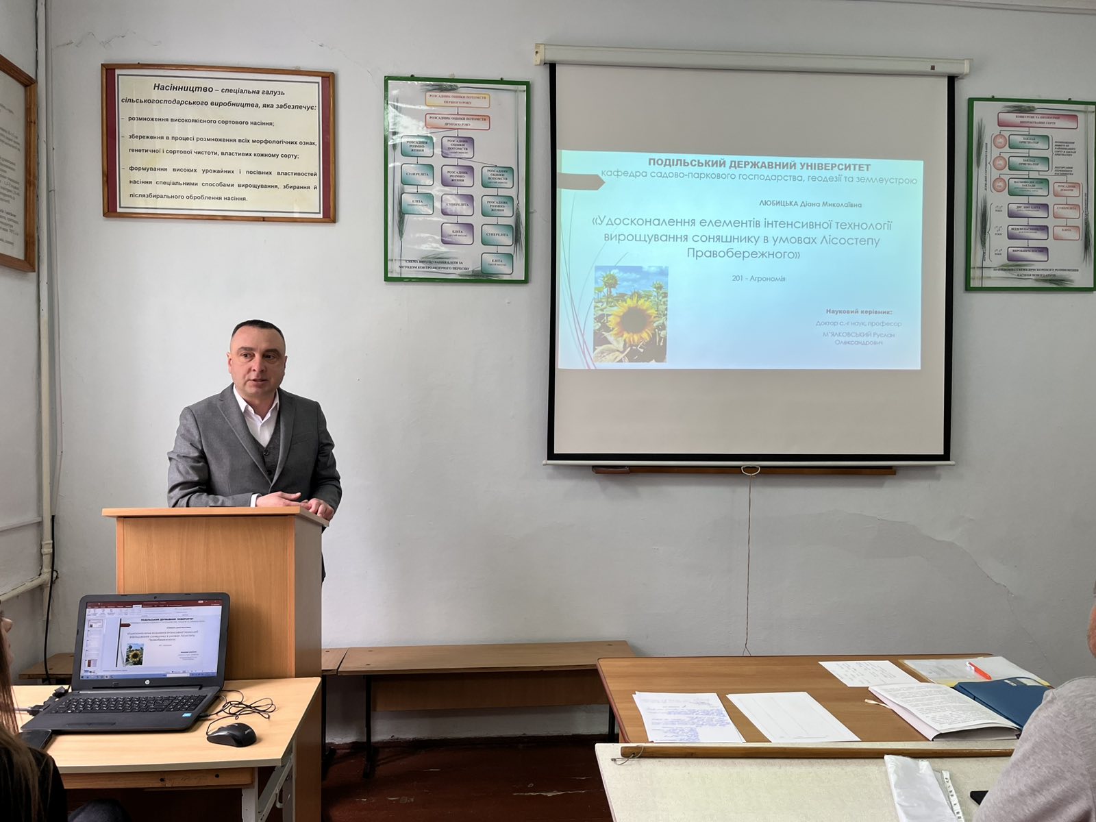 На факультеті агротехнологій і природокористування ЗВО «ПДУ» відбувся міжкафедральний семінар щодо визначення наукової новизни, теоретичного та практичного значення результатів дисертаційних робіт на здобуття наукового ступеня доктора філософії за спеціальністю 201 «Агрономія» Віталія ПАРАЩУКА на тему: «Урожайність та якість сировини нагідок лікарських залежно від комплексу технологічних факторів в умовах західного Лісостепу» (науковий керівник – доктор с.-г. наук, професор, завідувач кафедри рослинництва, селекції та насінництва Вероніка ХОМІНА) та Діани ЛЮБИЦЬКОЇ на тему: «Удосконалення елементів інтенсивної технології вирощування соняшнику в умовах Лісостепу Правобережного» (науковий керівник – доктор с.-г. наук, професор, завідувач кафедри садово-паркового господарства, геодезії та землеустрою Руслан М'ЯЛКОВСЬКИЙ).