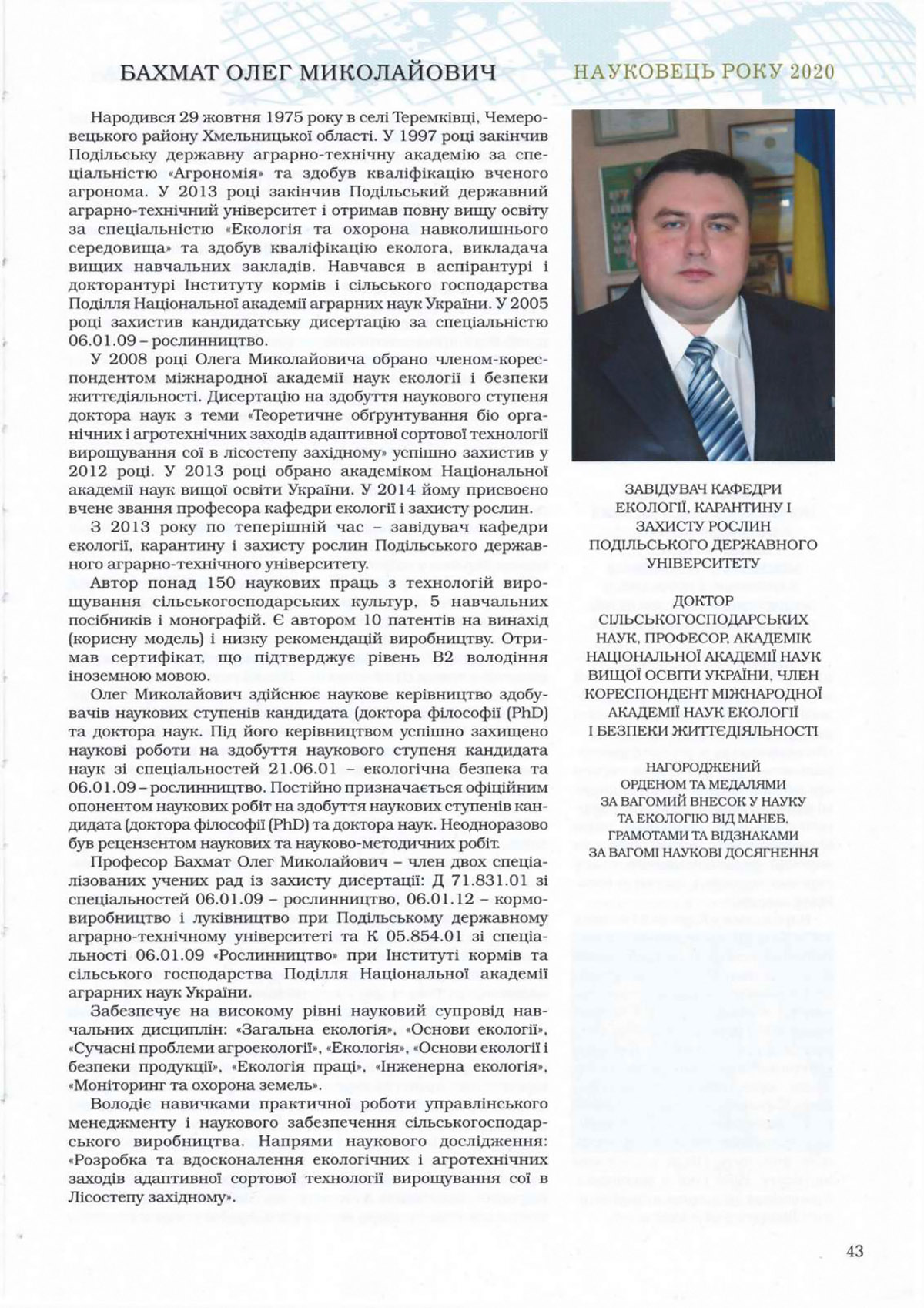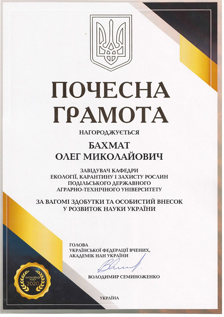 Пишаємося тим, що переможцем в номінації – «Агроекологія» став доктор сільськогосподарських наук, професор, завідувач кафедри екології, карантину і захисту рослин Подільського державного аграрно-технічного університету Бахмат Олег Миколайович.
