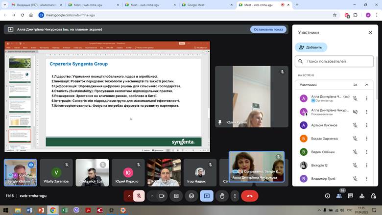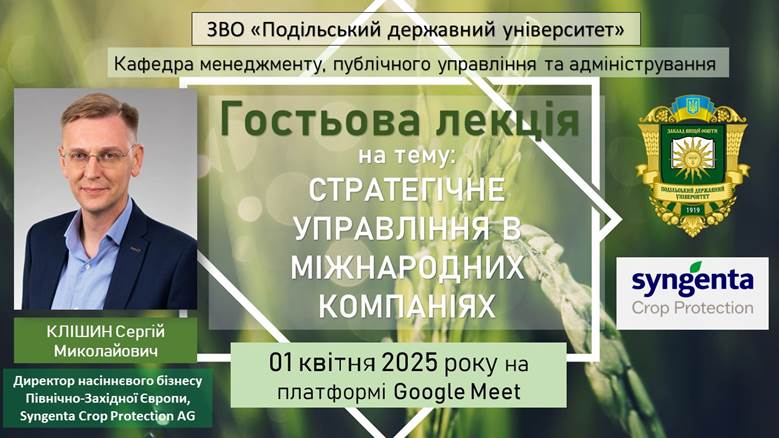 01 квітня 2025 року на кафедрі менеджменту, публічного управління та адміністрування відбулася гостьова лекція на тему «Стратегічне управління в міжнародних компаніях», яку провів Клішин Сергій Миколайович, директор насіннєвого бізнесу Північно-Західної Європи, Syngenta Crop Protection AG.