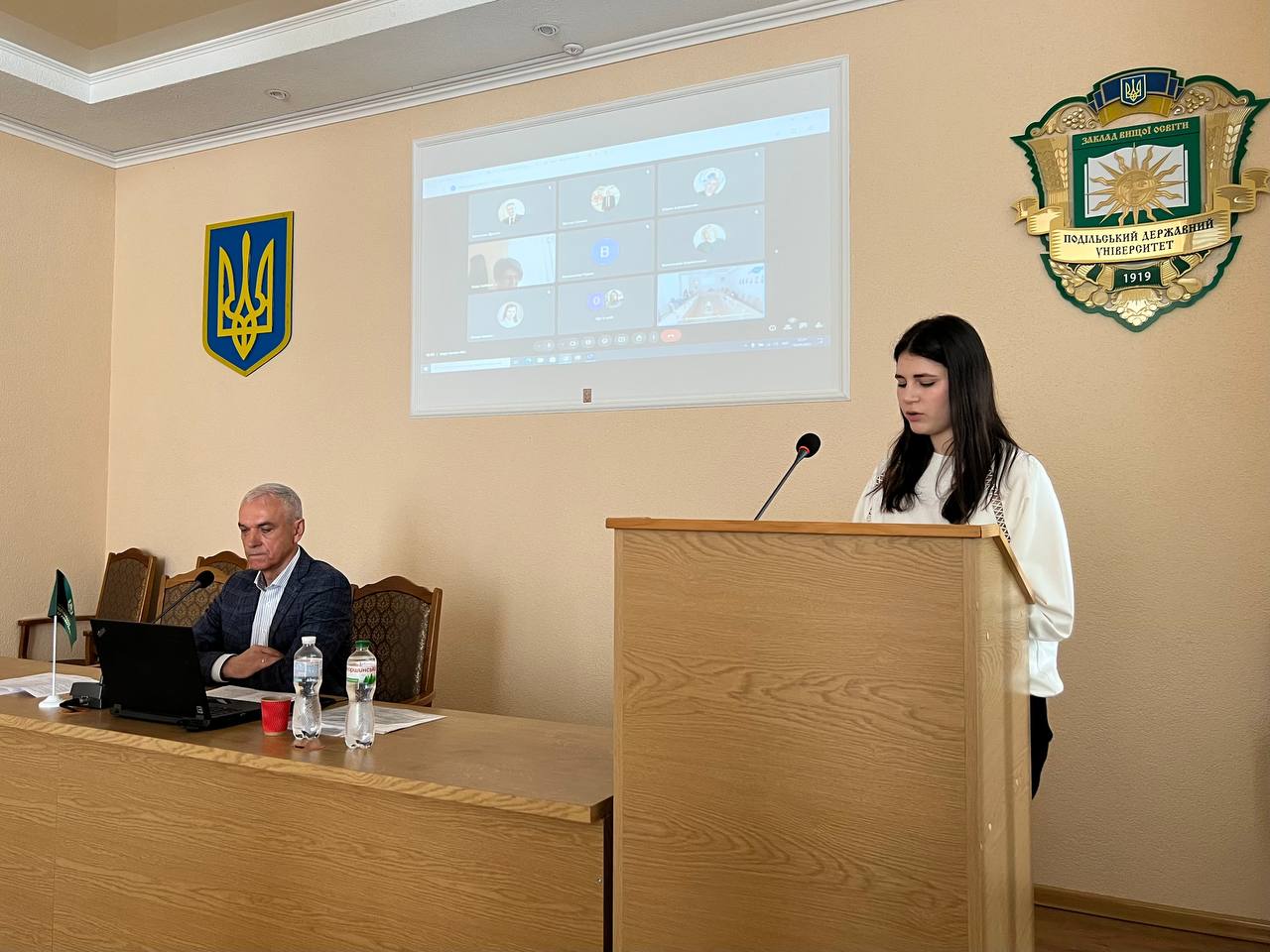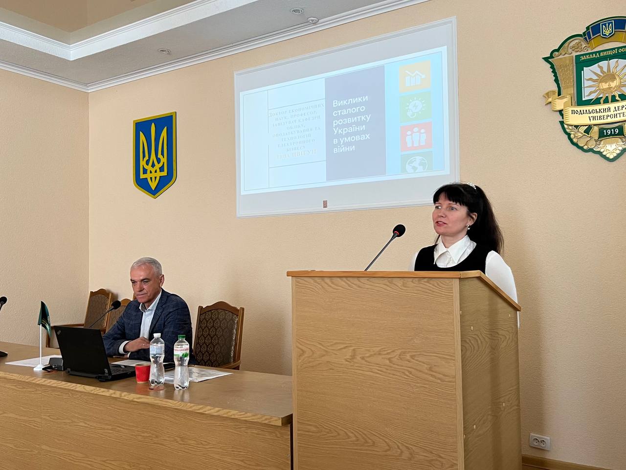 У роботі конференції взяли участь більше 100 науковців і здобувачів вищої освіти нашого університету, представників Вінницького національного аграрного університету, Поліського національного університету, Полтавського державного аграрного університету, Львівського національного університету ветеринарної медицини та біотехнологій імені С.З. Гжицького, Хмельницького університету управління та права імені Леоніда Юзькова, Чорноморського національного університету ім. Петра Могили, Прикарпатського національного університету імені Василя Стефаника, Закладу вищої освіти “Львівський державний університет внутрішніх справ”, Таврійський державний агротехнологічний університет імені Дмитра Моторного, ПВНЗ “Буковинський університет”, Закладу вищої освіти “Кам’янець-Подільський податковий інститут”, ВСП Технологічно-промисловий фаховий коледж Вінницького національного аграрного університету, ВСП “Фаховий коледж економіки, права та інформаційних технологій”, а також стейкхолдери освітніх програм спеціальності D2 «Фінанси, банківська справа, страхування та фондовий ринок» Оксана ДРАБИК, начальник сервісного центру обслуговування громадян ГУ Пенсійного фонду України в Хмельницькій області та Іванна УШАКОВА-ГАЛІЦИНА, начальник відділення Хмельницької філії АТ «Укрексімбанк» в м. Кам’янець – Подільський.