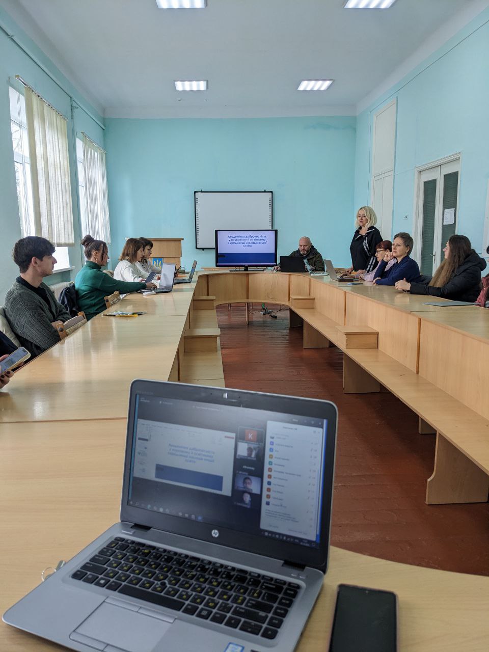 З вітальним словом до присутніх звернулась в.о. директора ННІБІФ професор Наталія КОРЖЕНІВСЬКА, яка наголосила на важливості проведення таких заходів. З доповіддю виступила кандидат філологічних наук, доцент кафедри української мови Лариса ГРОМИК, яка висвітлила теоретико-методичні аспекти реалізації політики академічної доброчесності та поділилася практичними порадами, а також власним досвідом й напрацюваннями у сфері забезпечення академічної доброчесності в нашому університеті. У межах заходу було розглянуто такі питання: