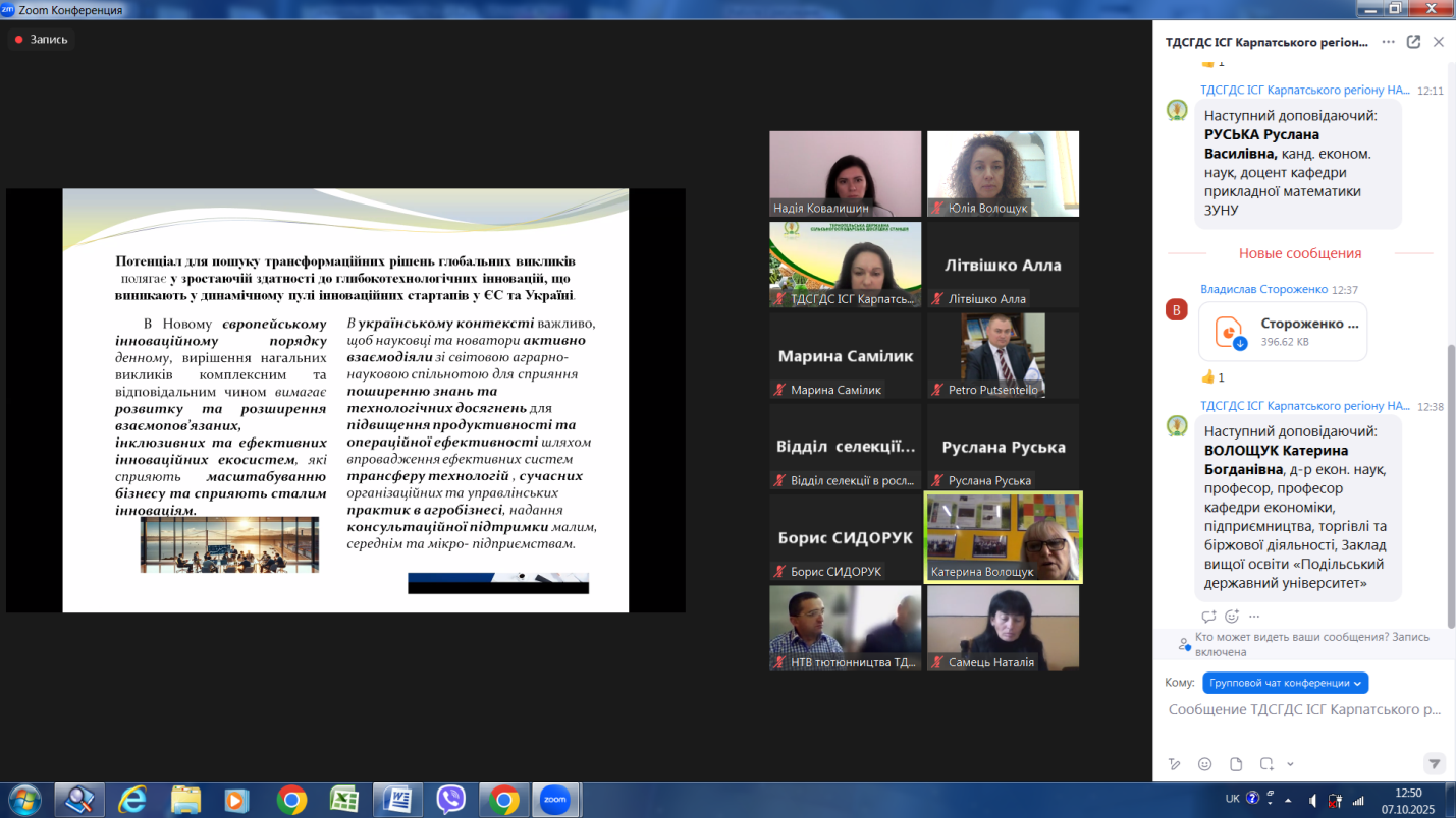 З доповідями виступили: д-р екон. наук, професор ВОЛОЩУК Катерина Богданівна, кандидат с.-г. наук, доцент ВІЛЬЧИНСЬКА Людмила Аліковна, д-р екон. наук, доцент ЗАХОДИМ Марина Володимирівна, д-р екон., наук, професор ВОЛОЩУК Юлія Олександрівна, кандидати екон. наук, доценти НІСХОДОВСЬКА Олена Юріївна та КОВАЛЬ Нонна Василівна.