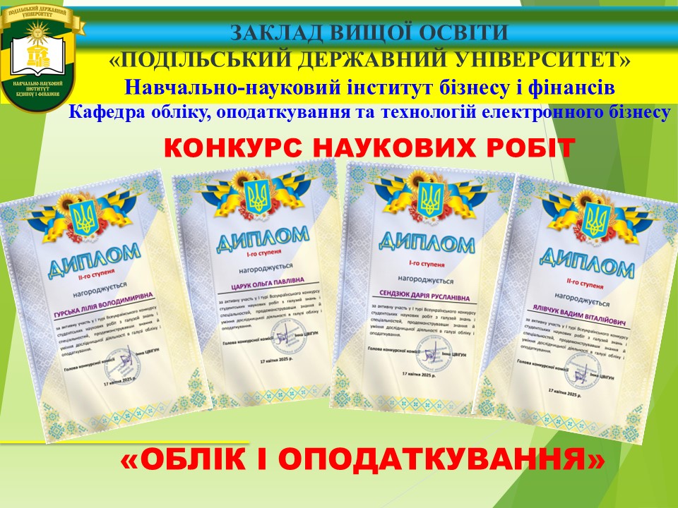 17 квітня 2025 року на кафедрі обліку, оподаткування та технологій електронного бізнесу Закладу вищої освіти «Подільський державний університет» відбувся конкурс наукових робіт зі спеціальності «Облік і оподаткування». Захід традиційно проводиться з метою виявлення обдарованої молоді, розвитку їхнього наукового потенціалу, формування дослідницьких компетентностей та підтримки талановитих студентів у професійному становленні.