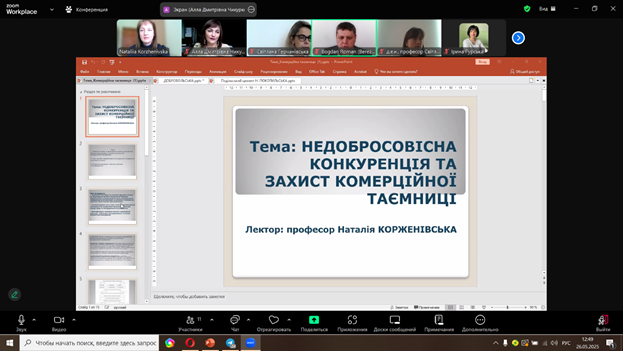 Наталія КОРЖЕНІВСЬКА, д-р екон. наук, професор, завідувач кафедри економіки, підприємництва, торгівлі та біржової діяльності. Тема доповіді: «Недобросовісна конкуренція та захист комерційної таємниці». Професор Наталія КОРЖЕНІВСЬКА проаналізувала недобросовісну конкуренцію та її вплив на бізнес. Вона представила механізми захисту комерційної таємниці в сучасних економічних умовах.