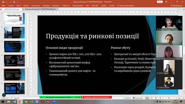 Наталія ПОКОТИЛЬСЬКА, канд. екон. наук, доцент кафедри менеджменту, публічного управління та адміністрування. Наталія ПОКОТИЛЬСЬКА презентувала кейс АТ «Подільський цемент», аналізуючи управлінські рішення та їх економічні результати. Вона розкрила стратегії адаптації до сучасних ринкових викликів.