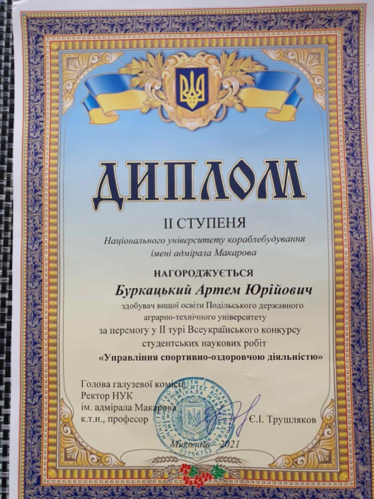 6 квітня 2021 року на базі Національного університету кораблебудування імені адмірала Макарова відбувся ІІ етап Всеукраїнського конкурсу студентських наукових робіт зі спеціалізації «Управління спортивно-оздоровчою діяльністю». З науковою доповіддю економічний факультет Подільського державного аграрно-технічного університету успішно представляв студент магістратури Буркацький Артем Юрійович (науковий керівник д-р. екон. наук, професор Чикуркова Алла Дмитрівна). Тема наукової роботи «Управління розвитком курортної діяльності в Україні». Студент здобув диплом ІІ ступеня.