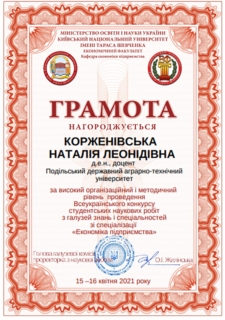 Відповідно до наказу Міністерства освіти і науки України від 24.11.2020 № 1457 протягом квітня 2021 р. на базі закладів вищої освіти України відбувся ІІ тур Всеукраїнських конкурсів студентських наукових робіт з відповідних спеціальностей. Конкурси було проведено в режимі онлайн-конференцій з дотриманням законодавства у частині запобігання поширенню на території України гострої респіраторної хвороби COVID-19, спричиненої коронавірусом SARS-CoV-2. Творча та активна молодь Подільського державного аграрно-технічного університету проявила високий рівень володіння навчальним матеріалом та наукової підготовки. Здобувачі вищої освіти під керівництвом досвідчених наукових керівників, професорів та доцентів економічного факультету ПДАТУ подали наукові роботи, які здобули перемогу на конкурсах: