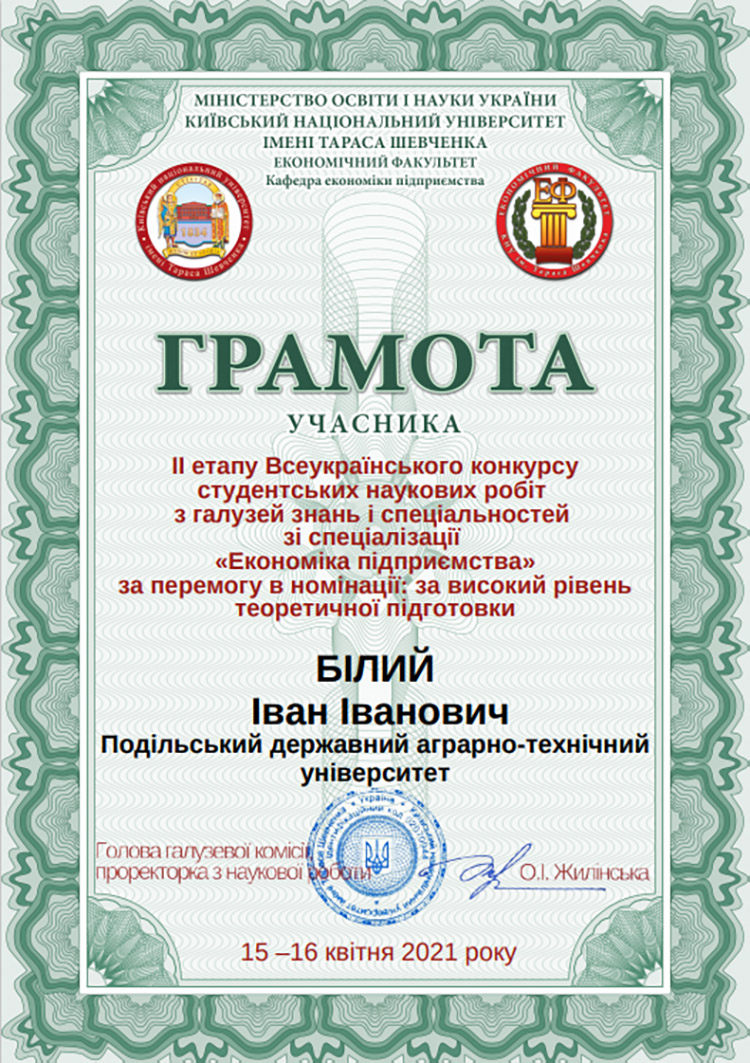 15-16 квітня 2021 року на базі економічного факультету Київського національного університету імені Тараса Шевченка відбувся ІІ етап Всеукраїнського конкурсу студентських наукових робіт зі спеціалізації «Економіка підприємства». З науковою доповіддю економічний факультет Подільського державного аграрно-технічного університету успішно представляв студент магістратури Білий Іван Іванович (науковий керівник канд. екон. наук, доцент Добровольська Елла Володимирівна). Тема наукової роботи «Ефективність ресурсного потенціалу». Студент нагороджений грамотою учасника конкурсу.