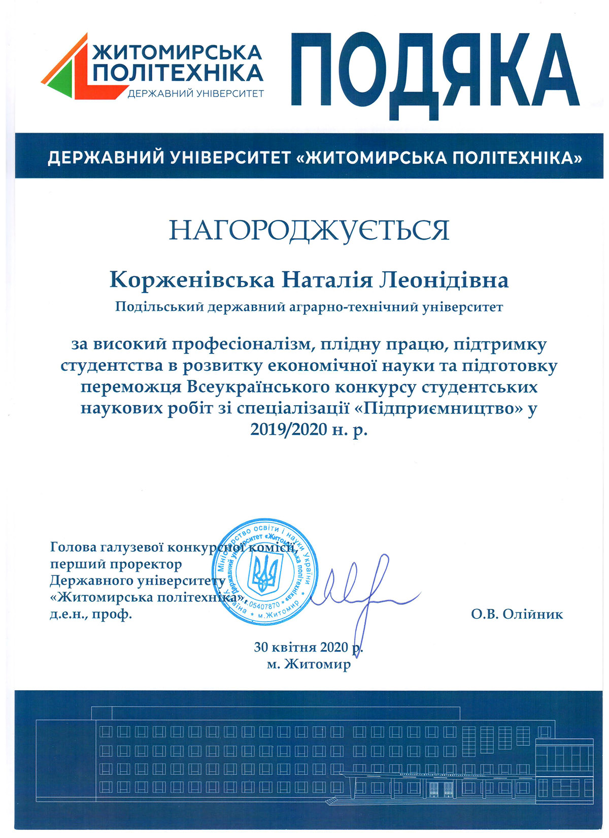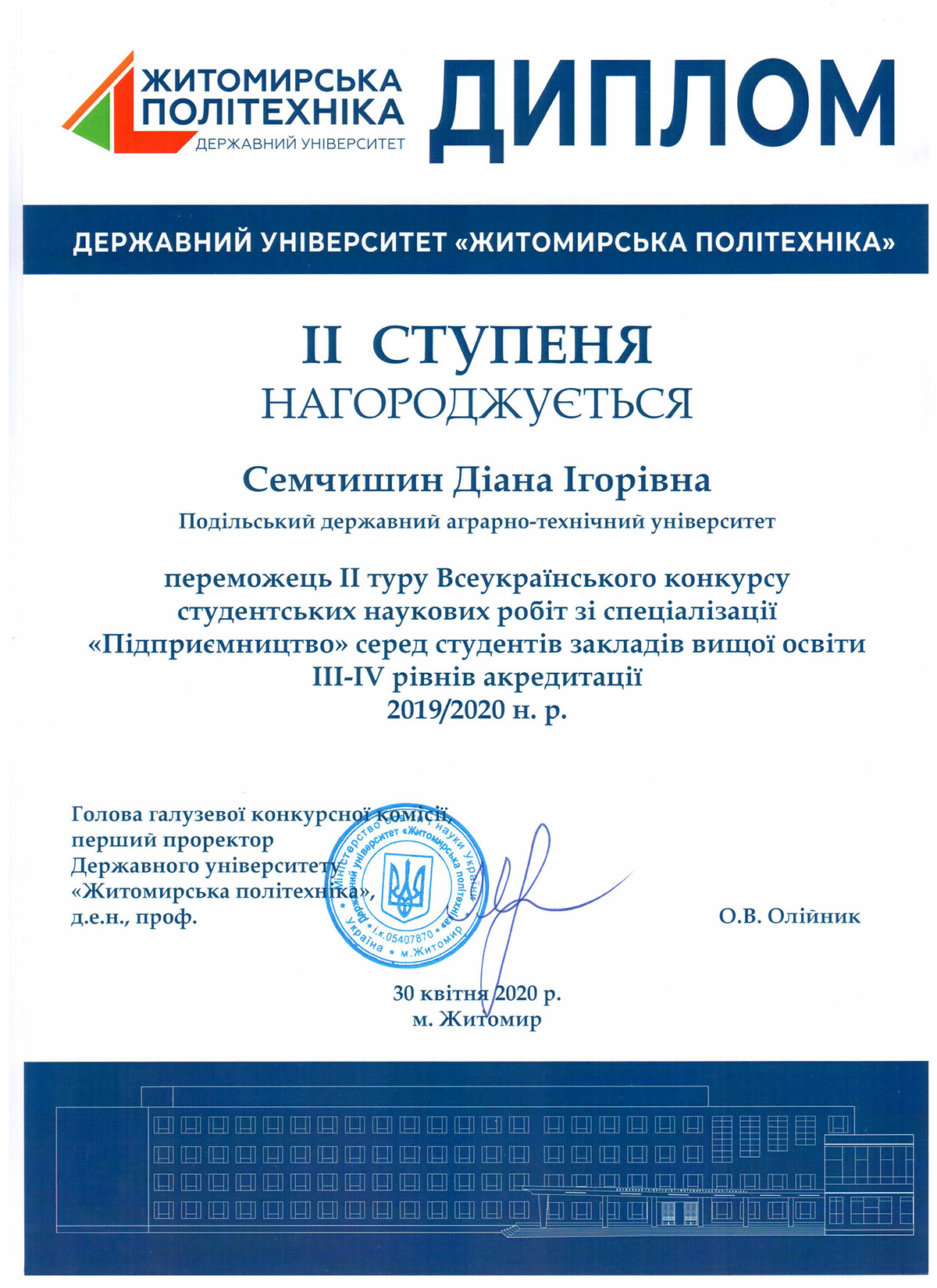 Відповідно до наказу Міністерства освіти і науки України від 04.10.2019 р. № 1271 «Про проведення Всеукраїнського конкурсу студентських наукових робіт з галузей знань і спеціальностей у 2019/2020 навчальному році» на базі Державного університету «Житомирська політехніка» відбувся II тур Всеукраїнського конкурсу студентських наукових робіт зі спеціалізації «Підприємництво».