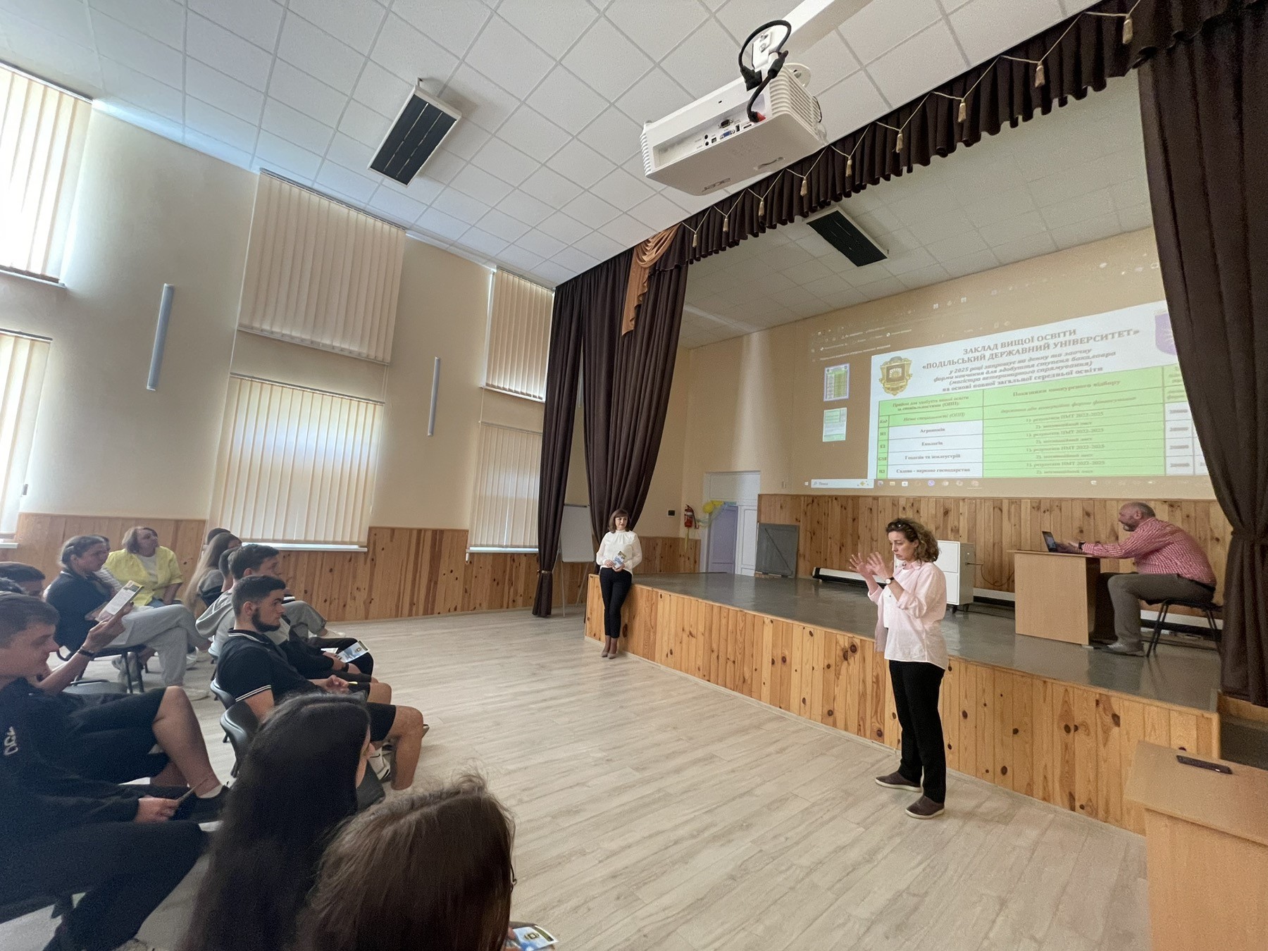 Докторка екон. наук, професорка, завідувачка кафедри менеджменту, публічного управління та адміністрування Чикуркова Алла Дмитрівна висвітлила питання професійної орієнтації та вибору майбутніх абітурієнтів, окресливши найбільш вагому інформацію про освітні програми і спеціальності університету, його матеріально-технічне забезпечення, можливості проходження виробничої практики і перспектив майбутнього працевлаштування та кар’єрного зростання. Акцентувала увагу школярів на активній співпраці нашого університету з роботодавцями, іноземними партнерами, випускниками. Підсумовуючи, вона зазначила, що Подільський державний університет буде радий бачити учнів ліцеїв в якості своїх здобувачів вищої освіти.