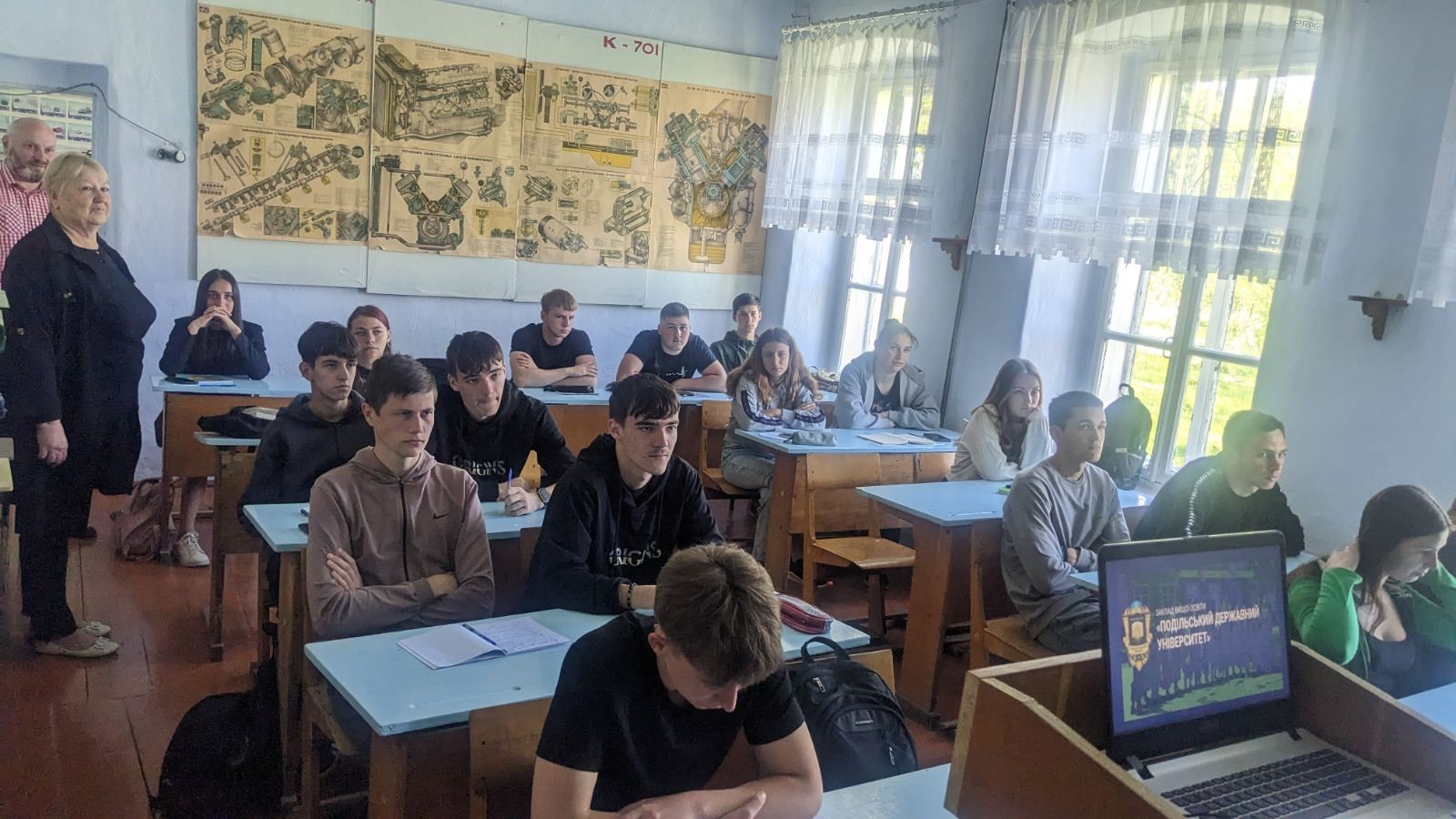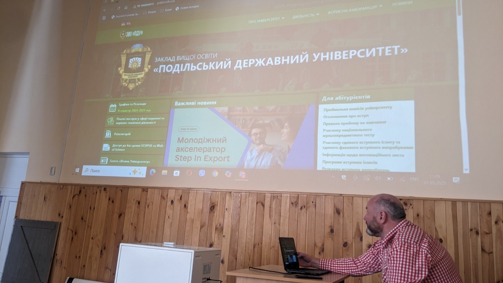 Доктор екон. наук, доцент Волощук Віталій Ростиславович провів учням віртуальну екскурсію сайтом університету, детально зупинившись на інформації для абітурієнтів. Окреслив особливості проведення освітнього процесу на різних факультетах та спеціальностях, ознайомив із особливостями вступної компанії 2025 року, а також розповів про діяльність студентського парламенту ЗВО «ПДУ».