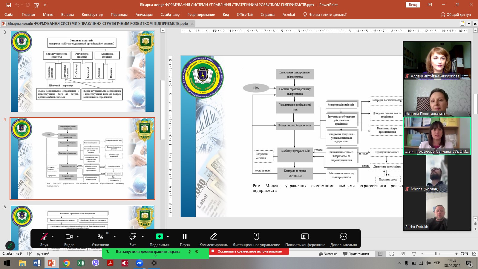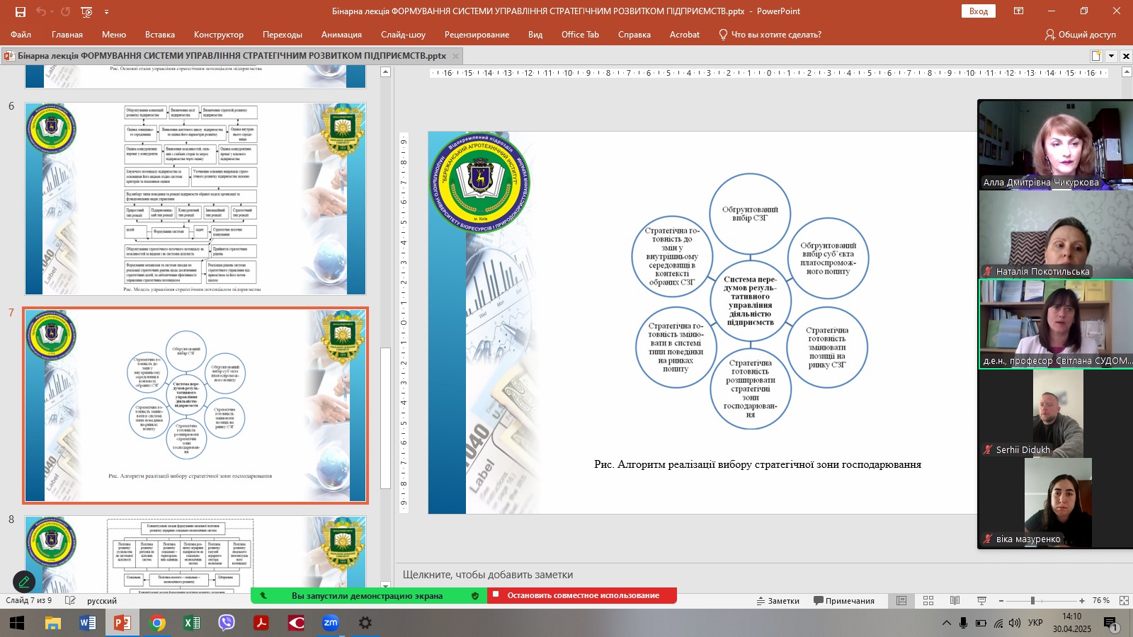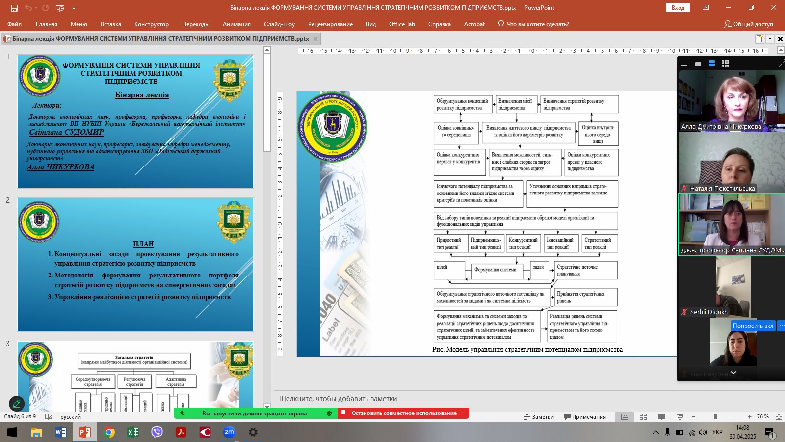 В рамках педагогічного стажування викладачів кафедри менеджменту, публічного управління та адміністрування ЗВО «ПДУ» 30 квітня 2025 року була проведена міжвузівська бінарна лекція доктором економічних наук, професором Аллою ЧИКУРКОВОЮ та гостьовим лектором, фахівцем зі стратегічного управління, яка має значний досвід у підготовці фахівців з менеджменту, доктором економічних наук, професором, професором кафедри економіки і менеджменту ВП НУБіП України «Бережанський агротехнічний інститут» Світланою СУДОМИР. Тема лекції: «Формування системи управління стратегічним розвитком підприємств».