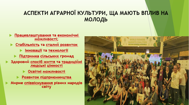 В ході дискусії учасники заходу прийшли до спільного висновку, що аграрна культура — це глибокий соціальний, економічний та екологічний фундамент для мирного, справедливого й сталого світу, у якому молодь відіграє ключову роль. Завдяки енергії, інноваційності та глобальному мисленню, молоді люди здатні зробити вагомий внесок у трансформацію аграрного сектора.