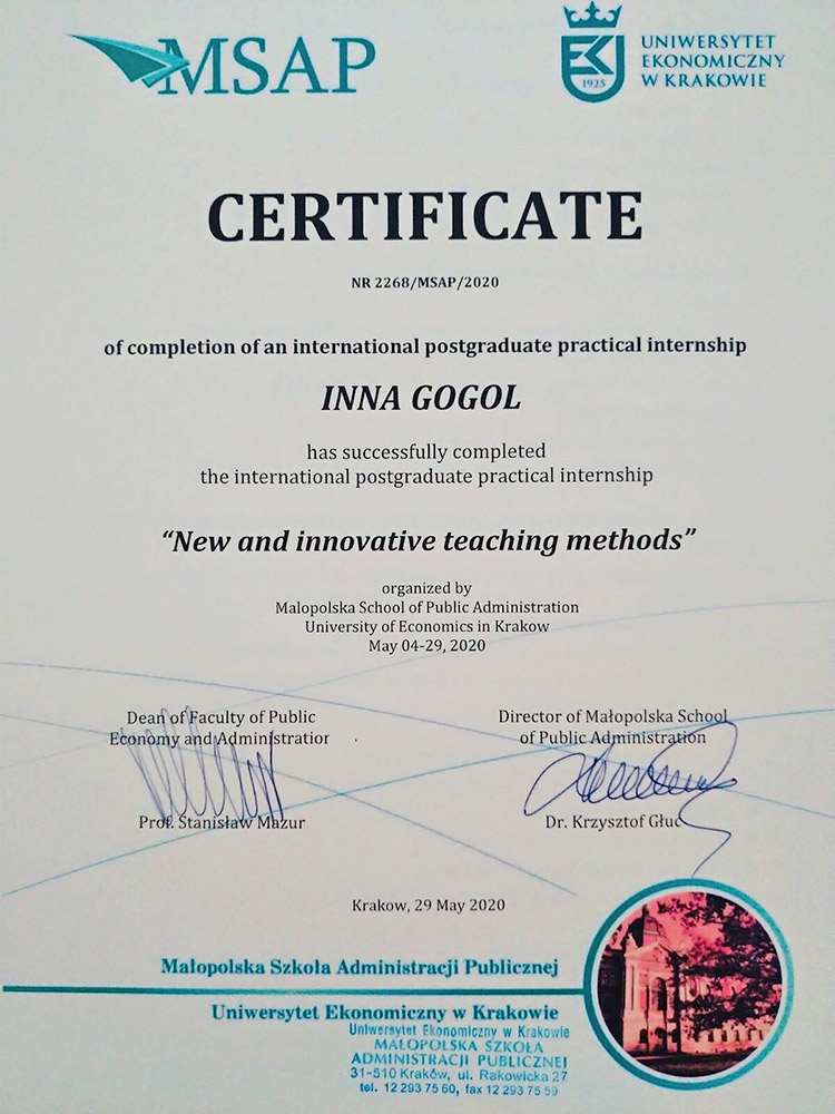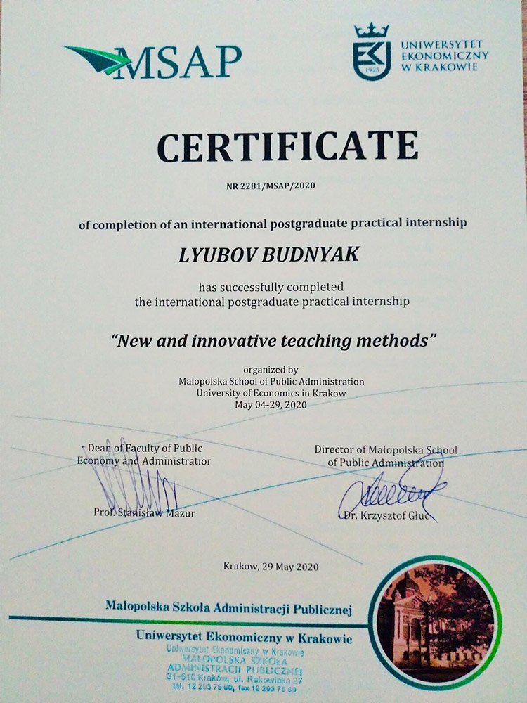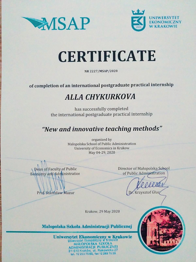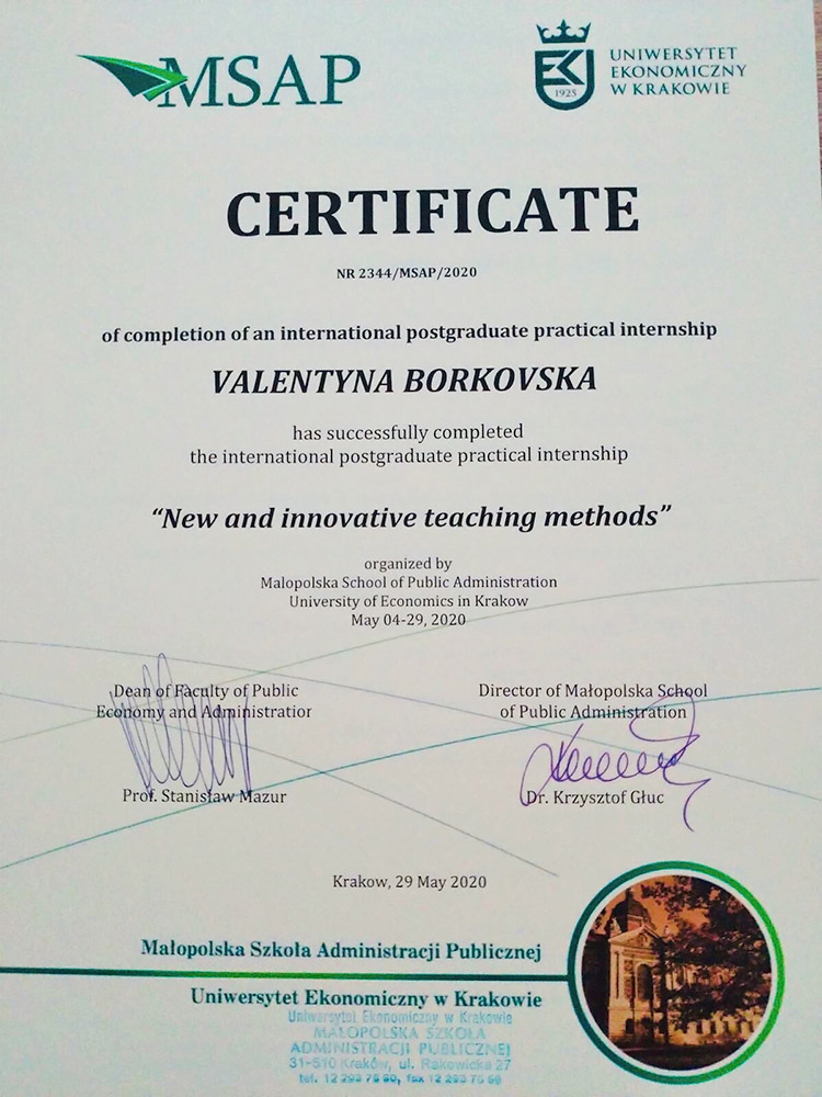 Найкращий варіант пройти стажування під час карантину та за відсутності можливості виїзду за кордон – це стажування онлайн. Так, викладачі економічного факультету ПДАТУ д.е.н., професор Чикуркова А.Д., к.е.н., асстент Гоголь І.А., к.е.н., доцент Борковська В.В., к.е.н., доцент Будняк Л.М. пройшли стажування від Європейської ліги професійного розвитку (ELPD) на базі Краківського економічного університету.