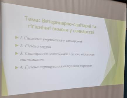 В ході лекції Іван БІДЯК розповів здобувачам про історію створення компанії та динаміку її розвитку, про особливості даного бізнесу його масштабування в Україні та за кордоном, проблеми та негативні чинники, що впливають на його розвиток. Впродовж виступу лектор акцентував увагу здобувачів на практичних аспектах тих теоретичних проблем, які вивчаються даною темою дисципліни «Ветеринарна санітарія і гігієна тварин», а саме: технології, системи, способи, альтернативні методи утримання свиней, механізацію технологічних процесів у свинарстві, типи свинарських приміщень та їх об’ємно-планувальні рішення. Зокрема Іван Миколайович наголосив, що гігієна тварин спрямована на профілактику хвороб всього стада. Низка незаразних хвороб тварин пов'язаних розладами роботи шлунково–кишкового тракту, органів дихання, порушенням обміну речовин, ураженням кінцівок – обумовлені порушенням правил гігієни і санітарії. Утримання тварин на промислових комплексах в умовах постійного впливу технологічних стресів призводить до того, що у кінцевому підсумку великі кошти витрачаються на проведення лікувальних, а не профілактичних заходів.