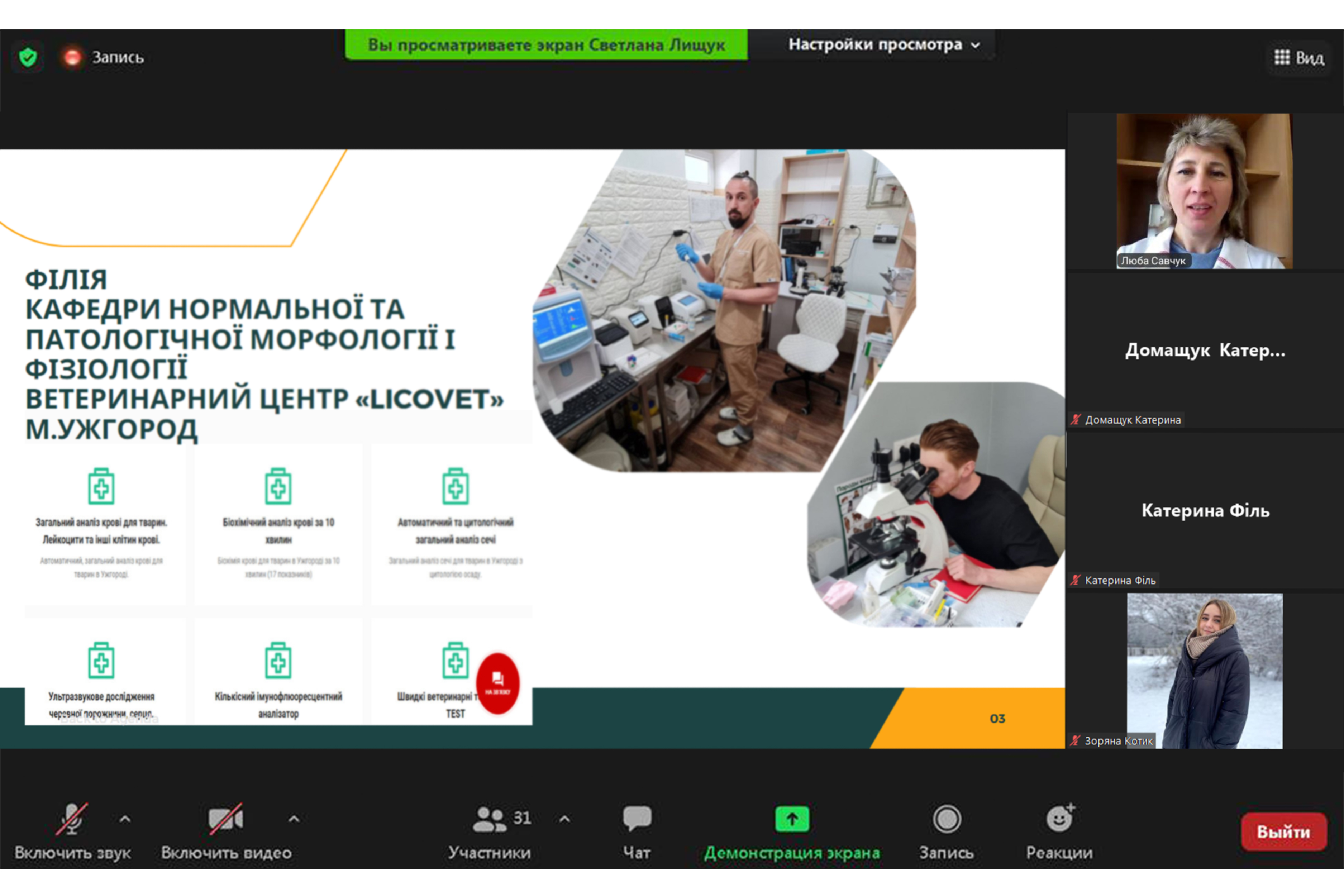Натомість, головний лікар ветеринарної клініки «LicoVet» Андрій КРАВЧЕНКО коротко розповів учасникам про діяльність ветеринарного центру, основні послуги, фармацевтичні новинки та цікаві випадки із практики ветеринарного лікаря. Співробітники кафедри підготували для гостей змістовну онлайн екскурсію музеєм «Анатомії» та «Патологічної анатомії» (асистент Володимир ДОБРОВОЛЬСЬКИЙ).