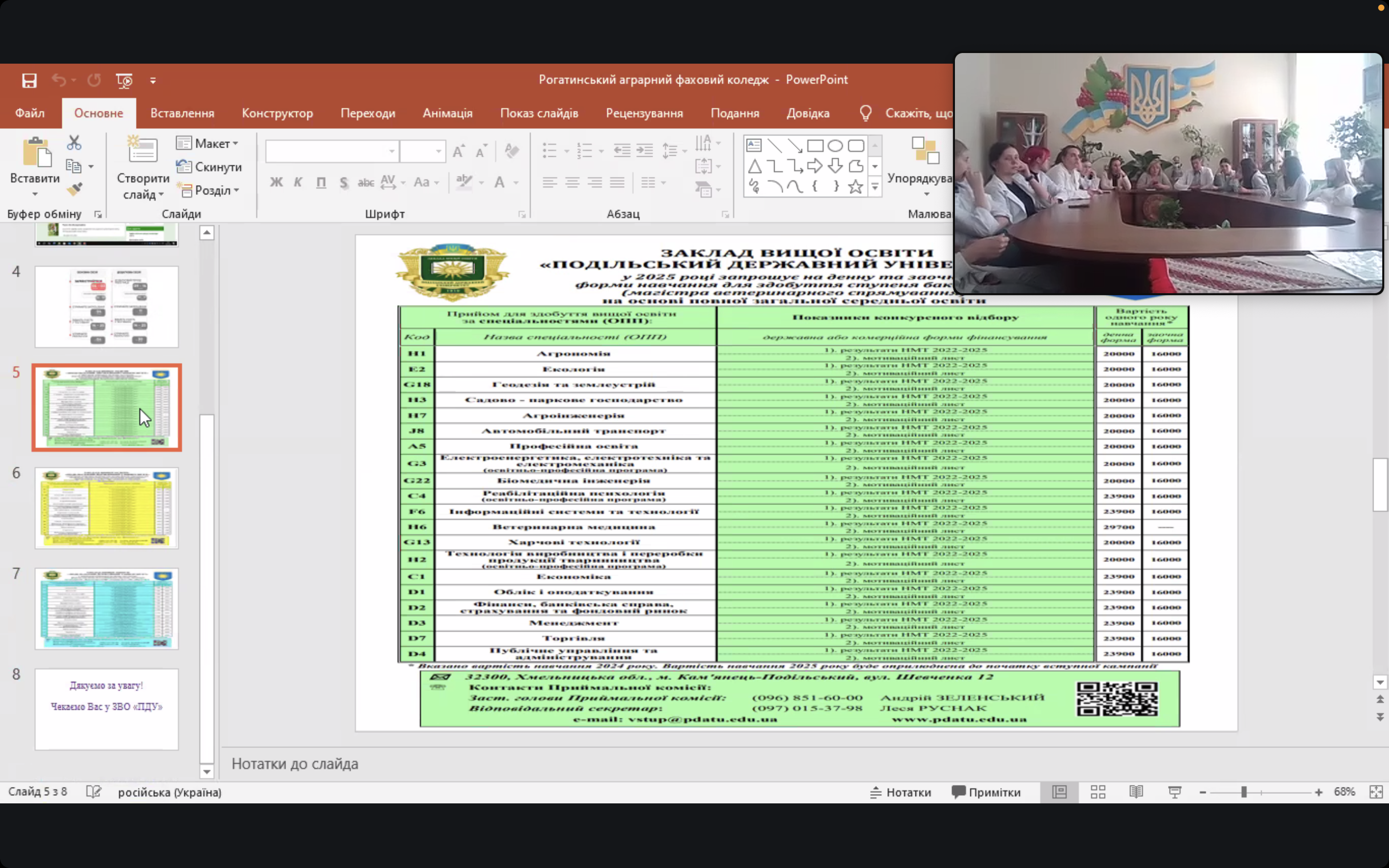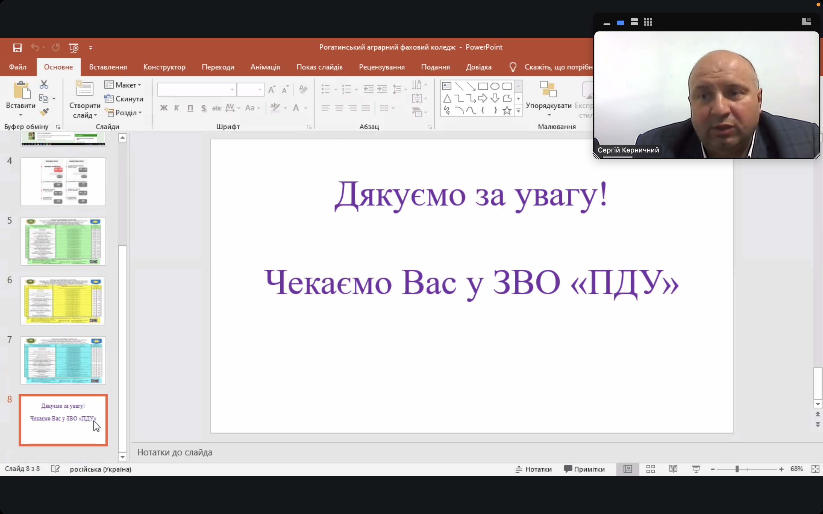 1 травня 2025 року відбулася онлайн-зустріч між науково-педагогічними працівниками нашого університету та студентами Рогатинського державного аграрного фахового коледжу. Захід мав профорієнтаційне спрямування і став ще одним важливим кроком у напрямку налагодження діалогу з потенційними абітурієнтами.