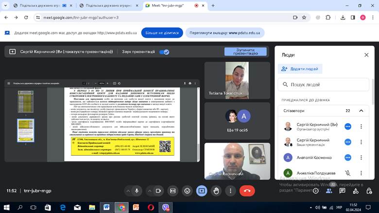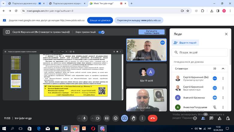 Відкрив зустріч вітальним словом декан Віктор ГОРЮК, розповів про етапи навчального процесу, перспективи і переваги навчання у ЗВО "ПДУ". Надав інформацію про проходження практики у багатьох країнах світу, звернув увагу майбутніх здобувачів на вибір спеціальності для подальшого працевлаштування. Більше про вступ 2024 до ЗВО "ПДУ" та організаційні моменти в цілому, які на сьогодні цікавлять майбутніх абітурієнтів з презентаційним матеріалом виступили доценти Сергій КЕРНИЧНИЙ і Тетяна ТОКАРЧУК.