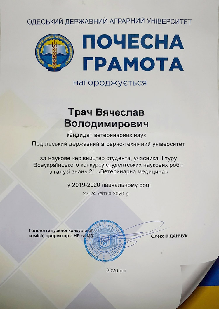 За результатами ІІ туру Всеукраїнського конкурсу студентських наукових робіт з галузі знань 21 «Ветеринарна медицина» спеціальності 211 «Ветеринарна медицина», який проходив в Одеському державному аграрному університеті, студент 3 курсу факультету ветеринарної медицини і технологій у тваринництві Подільського державного аграрно-технічного університету Боршуляк Андрій Сергійович був відзначений почесною грамотою за найкращу наукову розробку та практичну цінність отриманих результатів у 2019-2020 навчальному році. Науковий керівник – кандидат ветеринарних наук Трач Вячеслав Володимирович.