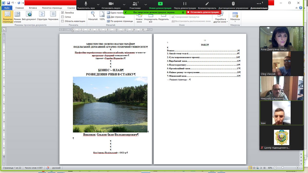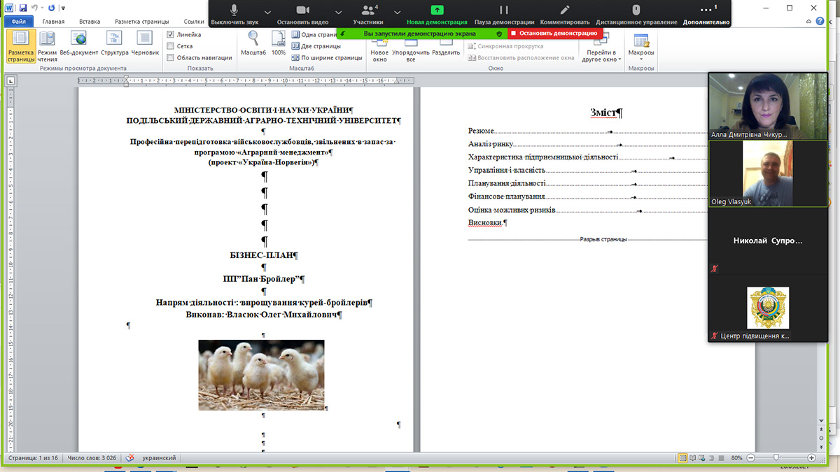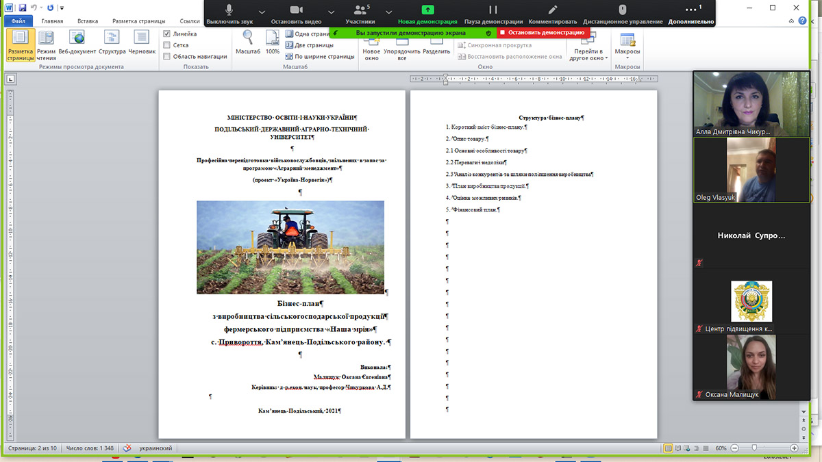 20 травня 2021 року в ПДУ відбулося підсумкове заняття з дисципліни «Бізнес-планування та ведення власної справи», на якому слухачі професійної перепідготовки військовослужбовців, звільнених в запас за програмою «Аграрний менеджмент» (проект «Норвегія-Україна») презентували свої бізнес-плани.