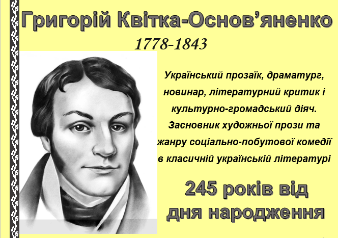 ГРИГОРІЙ КВІТКА-ОСНОВ’ЯНЕНКО український прозаїк, драматург, літературний критик і культурно-громадський діяч, засновник художньої прози та жанру соціально-побутової комедії в класичній українській літературі, народився 29 листопада 1778 р. – 245 років від дня народження.