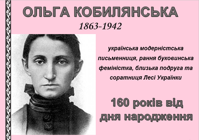 ОЛЬГА КОБИЛЯНСЬКА – українська модерністська письменниця, рання буковинська феміністка, близька подруга та соратниця Лесі Українки, народилася 27 листопада 1863 р. – 160 років від дня народження.